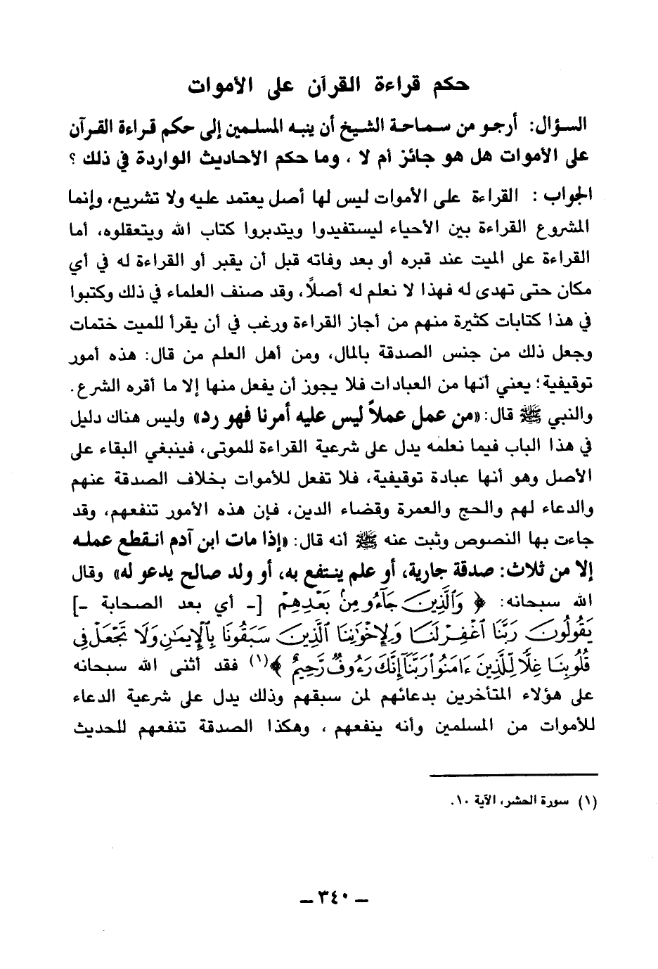 فينبغي البقاء على الأصل وهو أنها عبادة توقيفية، فلا تفعل للأموات. بخلاف الصدقة عنهم والدعاء لهم والحج والعمرة وقضاء الدين، فإن هذه الأمور تنفعهم، وقد جاءت بها النصوص وثبت عنه صلى الله عليه وسلم أنه قال: «إذا مات ابن آدم انقطع عمله إلا من ثلاث: صدقة جارية، أو علم ينتفع به، أو ولد صالح يدعو له (¬2) » وقال الله سبحانه: {وَالَّذِينَ جَاءُوا مِنْ بَعْدِهِمْ} (¬3) - أي بعد الصحابة - {يَقُولُونَ رَبَّنَا اغْفِرْ لَنَا وَلِإِخْوَانِنَا الَّذِينَ سَبَقُونَا بِالْإِيمَانِ وَلَا تَجْعَلْ فِي قُلُوبِنَا غِلًّا لِلَّذِينَ آمَنُوا رَبَّنَا إِنَّكَ رَءُوفٌ رَحِيمٌ} (¬4) فقد أثنى الله سبحانه على هؤلاء المتأخرين بدعائهم لمن سبقهم وذلك يدل على شرعية الدعاء للأموات من المسلمين وأنه ينفعهم، وهكذا الصدقة تنفعهم للحديث