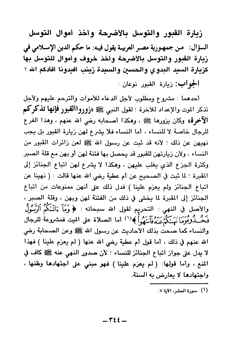 سؤال من جمهورية مصر العربية يقول فيه: ما حكم الدين الإسلامي في زيارة القبور والتوسل بالأضرحة وأخذ خروف وأموال للتوسل بها كزيارة السيد البدوي والحسين والسيدة زينب أفيدونا أفادكم الله. .