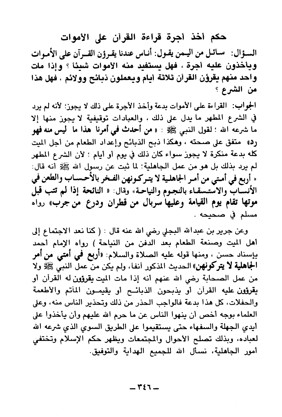 ج: القراءة على الأموات بدعة وأخذ الأجرة على ذلك لا يجوز لأنه لم يرد في الشرع المطهر ما يدل على ذلك، والعبادات توقيفية لا يجوز منها إلا ما شرعه الله؛ لقول النبي صلى الله عليه وسلم: «من أحدث في أمرنا هذا ما ليس منه فهو رد (¬1) » متفق على صحته، وهكذا ذبح الذبائح وإعداد الطعام من أجل الميت كله بدعة منكرة لا يجوز سواء كان ذلك في يوم أو أيام؛ لأن الشرع المطهر لم يرد بذلك بل هو من عمل الجاهلية؛ لما ثبت عن رسول الله صلى الله عليه وسلم أنه قال: «أربع في أمتي من أمر الجاهلية لا يتركونهن؛ الفخر بالأحساب والطعن في الأنساب والاستسقاء بالنجوم والنياحة (¬2) » وقال: «النائحة إذا لم تتب قبل موتها تقام يوم القيامة وعليها سربال من قطران ودرع من جرب (¬3) » رواه مسلم في صحيحه.