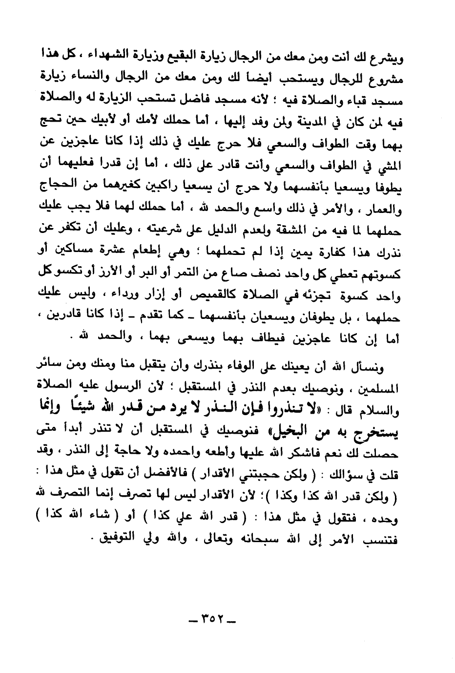 ونسأل الله أن يعينك على الوفاء بنذرك وأن يتقبل منا ومنك ومن سائر المسلمين ونوصيك بعدم النذر في المستقبل؛ لأن الرسول عليه الصلاة والسلام قال: «لا تنذروا فإن النذر لا يرد من قدر الله شيئا وإنما يستخرج به من البخيل (¬1) » فنوصيك في المستقبل أن لا تنذر أبدا متى حصلت لك نعم فاشكر الله عليها وأطعه واحمده ولا حاجة إلى النذر وقد قلت في سؤالك: (ولكن حجبتني الأقدار) فالأفضل أن تقول في مثل هذا: (ولكن قدر الله كذا وكذا) ؛ لأن الأقدار ليس لها تصرف إنما التصرف لله وحده فتقول في مثل هذا: (قدر الله علي كذا) أو (شاء الله كذا) فتنسب الأمر إلى الله سبحانه وتعالى، والله ولي التوفيق.