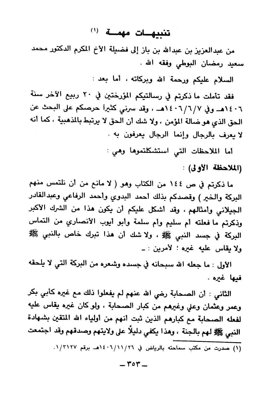 (¬1) صدرت من مكتب سماحته بالرياض في 26 \ 11 \ 1406هـ برقم 3127 \1.