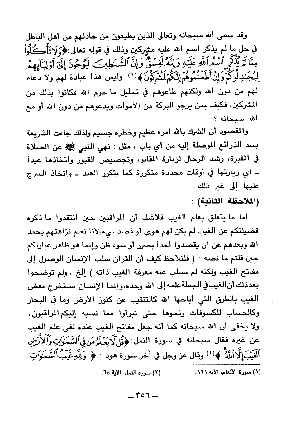أما ما يتعلق بعلم الغيب فلا شك أن المراقبين حين انتقدوا ما ذكره فضيلتكم عن الغيب لم يكن لهم هوى أو قصد سيئ؛ لأنا نعلم نزاهتهم بحمد الله وبعدهم عن أن يقصدوا أحدا بضرر أو سوء ظن وإنما هو ظاهر عبارتكم حين قلتم ما نصه: (فلنلاحظ كيف أن القرآن سلب الإنسان الوصول إلى مفاتح الغيب ولكنه لم يسلب عنه معرفة الغيب ذاته) إلخ، ولم توضحوا بعد ذلك أن الغيب في الجملة علمه إلى الله وحده، وإنما الإنسان يستخرج بعض الغيب بالطرق التي أباحها الله كالتنقيب عن كنوز الأرض وما في البحار وكالحساب للكسوفات ونحوها حتى تبرأوا مما نسبه إليكم المراقبون، ولا يخفى أن الله سبحانه كما أنه جعل مفاتح الغيب عنده نفى علم الغيب عن غيره فقال سبحانه في سورة النمل: {قُلْ لَا يَعْلَمُ مَنْ فِي السَّمَاوَاتِ وَالْأَرْضِ الْغَيْبَ إِلَّا اللَّهُ} (¬2) وقال عز وجل في آخر سورة هود: {وَلِلَّهِ غَيْبُ السَّمَاوَاتِ وَالْأَرْضِ وَإِلَيْهِ يُرْجَعُ الْأَمْرُ كُلُّهُ فَاعْبُدْهُ وَتَوَكَّلْ عَلَيْهِ} (¬3) الآية.