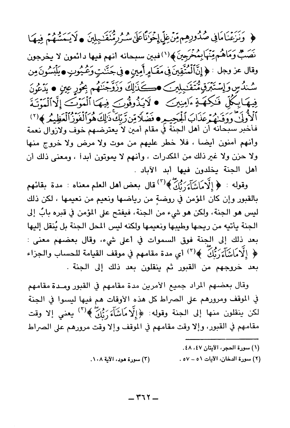 {وَنَزَعْنَا مَا فِي صُدُورِهِمْ مِنْ غِلٍّ إِخْوَانًا عَلَى سُرُرٍ مُتَقَابِلِينَ} (¬1) {لَا يَمَسُّهُمْ فِيهَا نَصَبٌ وَمَا هُمْ مِنْهَا بِمُخْرَجِينَ} (¬2) فبين سبحانه أنهم فيها دائمون لا يخرجون، وقال عز وجل: {إِنَّ الْمُتَّقِينَ فِي مَقَامٍ أَمِينٍ} (¬3) {فِي جَنَّاتٍ وَعُيُونٍ} (¬4) {يَلْبَسُونَ مِنْ سُنْدُسٍ وَإِسْتَبْرَقٍ مُتَقَابِلِينَ} (¬5) {كَذَلِكَ وَزَوَّجْنَاهُمْ بِحُورٍ عِينٍ} (¬6) {يَدْعُونَ فِيهَا بِكُلِّ فَاكِهَةٍ آمِنِينَ} (¬7) {لَا يَذُوقُونَ فِيهَا الْمَوْتَ إِلَّا الْمَوْتَةَ الْأُولَى وَوَقَاهُمْ عَذَابَ الْجَحِيمِ} (¬8) {فَضْلًا مِنْ رَبِّكَ ذَلِكَ هُوَ الْفَوْزُ الْعَظِيمُ} (¬9) فأخبر سبحانه أن أهل الجنة في مقام أمين لا يعترضهم خوف ولا زوال نعمة وأنهم آمنون أيضا، فلا خطر عليهم من موت ولا مرض ولا خروج منها ولا حزن ولا غير ذلك من المكدرات، وأنهم لا يموتون أبدا، ومعنى ذلك أن أهل الجنة يخلدون فيها أبد الآباد.
