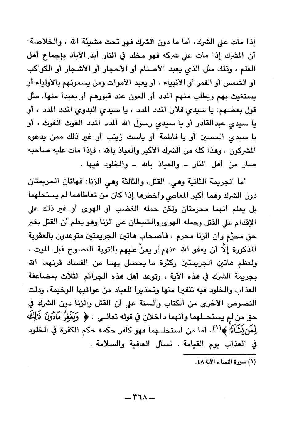 أما الجريمة الثانية وهي: القتل، والثالثة وهي الزنا: فهاتان الجريمتان دون الشرك وهما أكبر المعاصي وأخطرها إذا كان من تعاطاهما لم يستحلهما بل يعلم أنهما محرمتان ولكن حمله الغضب أو الهوى أو غير ذلك على الإقدام على القتل وحمله الهوى والشيطان على الزنا وهو يعلم أن القتل بغير حق محرم وأن الزنا محرم فأصحاب هاتين الجريمتين متوعدون بالعقوبة المذكورة إلا أن يعفو الله عنهم أو يمن عليهم بالتوبة النصوح قبل الموت، ولعظم هاتين الجريمتين وكثرة ما يحصل بهما من الفساد قرنهما الله بجريمة الشرك في هذه الآية، وتوعد أهل هذه الجرائم الثلاث بمضاعفة العذاب والخلود فيه تنفيرا منها وتحذيرا للعباد من عواقبها الوخيمة، ودلت النصوص الأخرى من الكتاب والسنة على أن القتل والزنا دون الشرك في حق من لم يستحلهما وأنهما داخلان في قوله تعالى: {وَيَغْفِرُ مَا دُونَ ذَلِكَ لِمَنْ يَشَاءُ} (¬1) أما من استحلها فهو كافر حكمه حكم الكفرة في الخلود في العذاب يوم القيامة. نسأل العافية والسلامة.