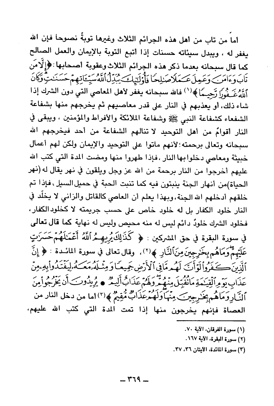 أما من تاب من أهل هذه الجرائم الثلاث وغيرها توبة نصوحا فإن الله يغفر له، ويبدل سيئاته حسنات إذا أتبع التوبة بالإيمان والعمل الصالح كما قال سبحانه بعد ما ذكر هذه الجرائم الثلاث وعقوبة أصحابها: {إِلَّا مَنْ تَابَ وَآمَنَ وَعَمِلَ عَمَلًا صَالِحًا فَأُولَئِكَ يُبَدِّلُ اللَّهُ سَيِّئَاتِهِمْ حَسَنَاتٍ وَكَانَ اللَّهُ غَفُورًا رَحِيمًا} (¬1) فالله سبحانه يغفر لأهل المعاصي التي دون الشرك إذا شاء ذلك، أو يعذبهم في النار على قدر معاصيهم ثم يخرجهم منها بشفاعة الشفعاء كشفاعة النبي صلى الله عليه وسلم وشفاعة الملائكة والأفراط والمؤمنين، ويبقى في النار أقوام من أهل التوحيد لا تنالهم الشفاعة من أحد فيخرجهم الله سبحانه وتعالى برحمته لأنهم ماتوا على التوحيد والإيمان ولكن لهم أعمال خبيثة ومعاصي دخلوا بها النار، فإذا طهروا منها ومضت المدة التي كتب الله عليهم أخرجوا من النار برحمة من الله عز وجل ويلقون في نهر يقال له (نهر الحياة) من أنهار الجنة ينبتون فيه كما تنبت الحبة في حمأ السيل، فإذا تم خلقهم أدخلهم الله الجنة.