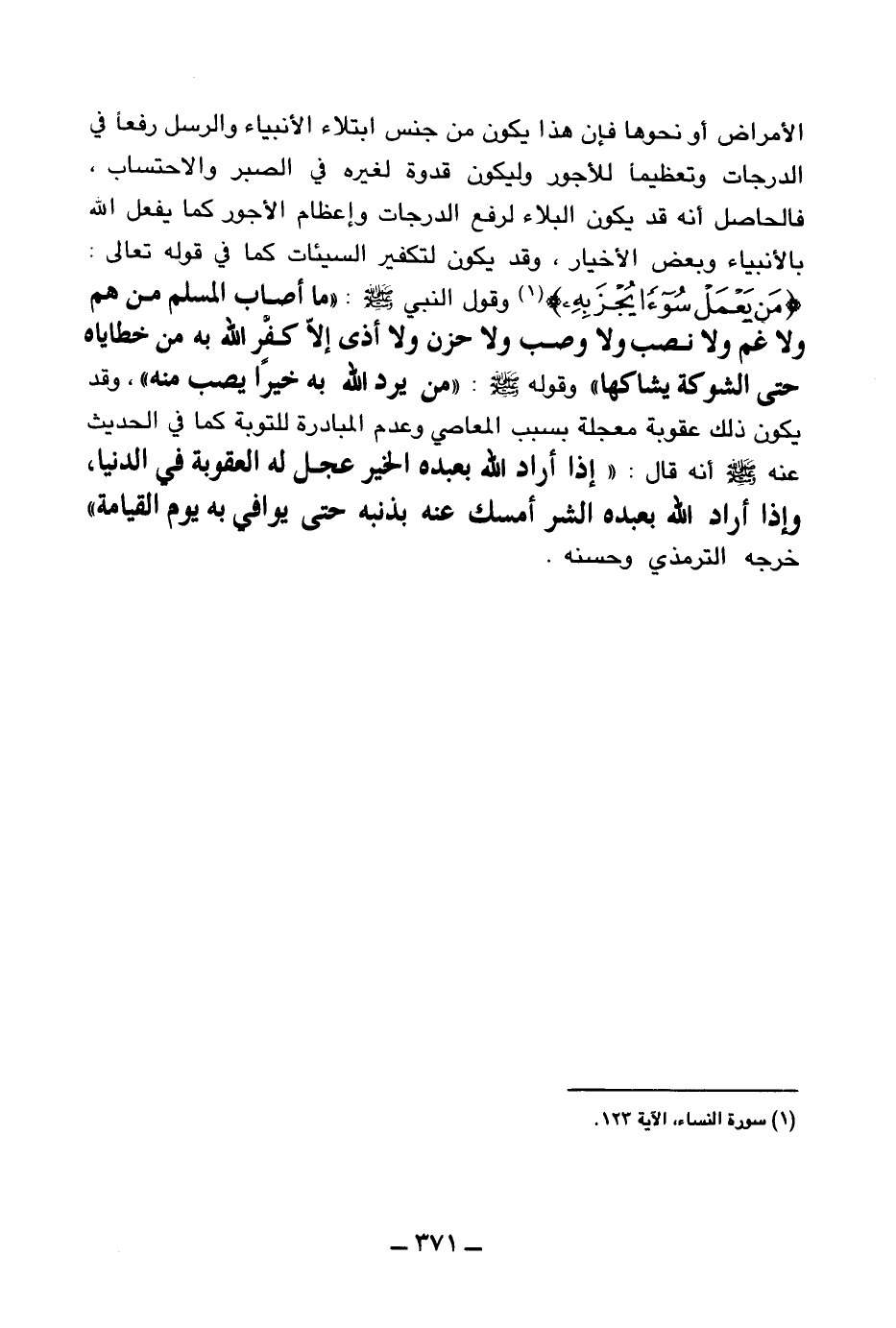 الأمراض أو نحوها فإن هذا يكون من جنس ابتلاء الأنبياء والرسل رفعا في الدرجات وتعظيما للأجور وليكون قدوة لغيره في الصبر والاحتساب، فالحاصل أنه قد يكون البلاء لرفع الدرجات وإعظام الأجور كما يفعل الله بالأنبياء وبعض الأخيار، وقد يكون لتكفير السيئات كما في قوله تعالى: {مَنْ يَعْمَلْ سُوءًا يُجْزَ بِهِ} (¬1) وقول النبي صلى الله عليه وسلم: «ما أصاب المسلم من هم ولا غم ولا نصب ولا وصب ولا حزن ولا أذى إلا كفر الله به من خطاياه حتى الشوكة يشاكها (¬2) » وقوله صلى الله عليه وسلم: «من يرد الله به خيرا يصب منه (¬3) » وقد يكون ذلك عقوبة معجلة بسبب المعاصي وعدم المبادرة للتوبة كما في الحديث عنه صلى الله عليه وسلم أنه قال: «إذا أراد الله بعبده الخير عجل له العقوبة في الدنيا وإذا أراد الله بعبده الشر أمسك عنه بذنبه حتى يوافي به يوم القيامة (¬4) » خرجه الترمذي وحسنه.