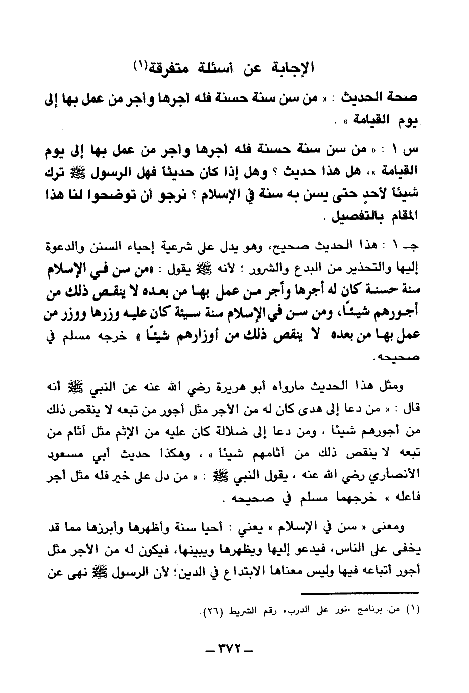 ج1: هذا الحديث صحيح، وهو يدل على شرعية إحياء السنن والدعوة إليها والتحذير من البدع والشرور لأنه صلى الله عليه وسلم يقول: «من سن في الإسلام سنة حسنة كان له أجرها وأجر من عمل بها من بعده لا ينقص ذلك من أجورهم شيئا ومن سن في الإسلام سنة سيئة كان عليه وزرها ووزر من عمل بها من بعده لا ينقص ذلك من أوزارهم شيئا (¬4) » خرجه مسلم في صححيه.