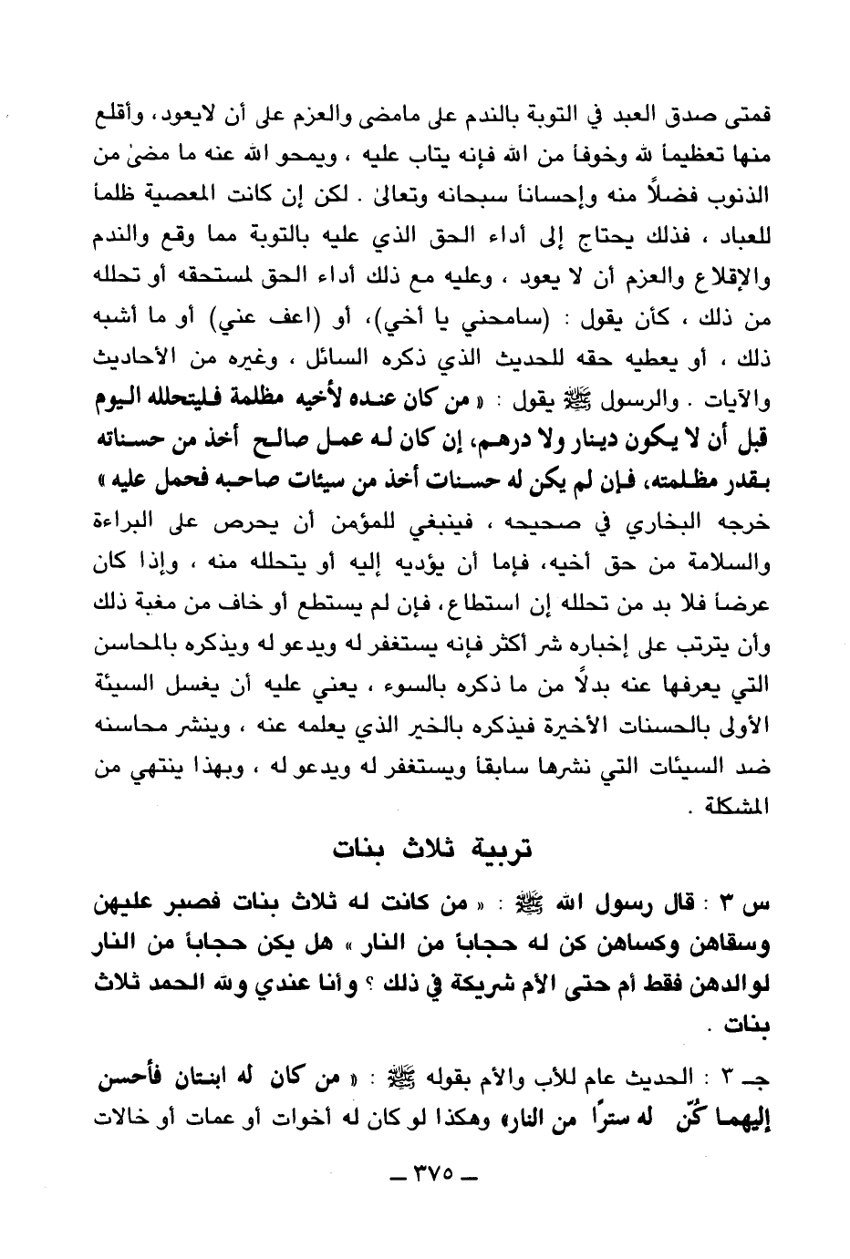 س3: قال رسول الله صلى الله عليه وسلم: «من كانت له ثلات بنات فصبر عليهن وسقاهن وكساهن كن له حجابا من النار (¬1) » هل يكن حجابا من النار لوالدهن فقط أم حتى الأم شريكة في ذلك؟ وأنا عندي ولله الحمد ثلاث بنات. .