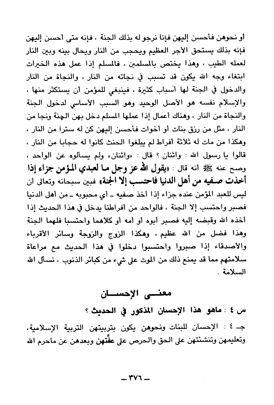 ج4: الإحسان للبنات ونحوهن يكون بتربيتهن التربية الإسلامية، وتعليمهن وتنشئتهن على الحق والحرص على عفتهن وبعدهن عن ما حرم الله