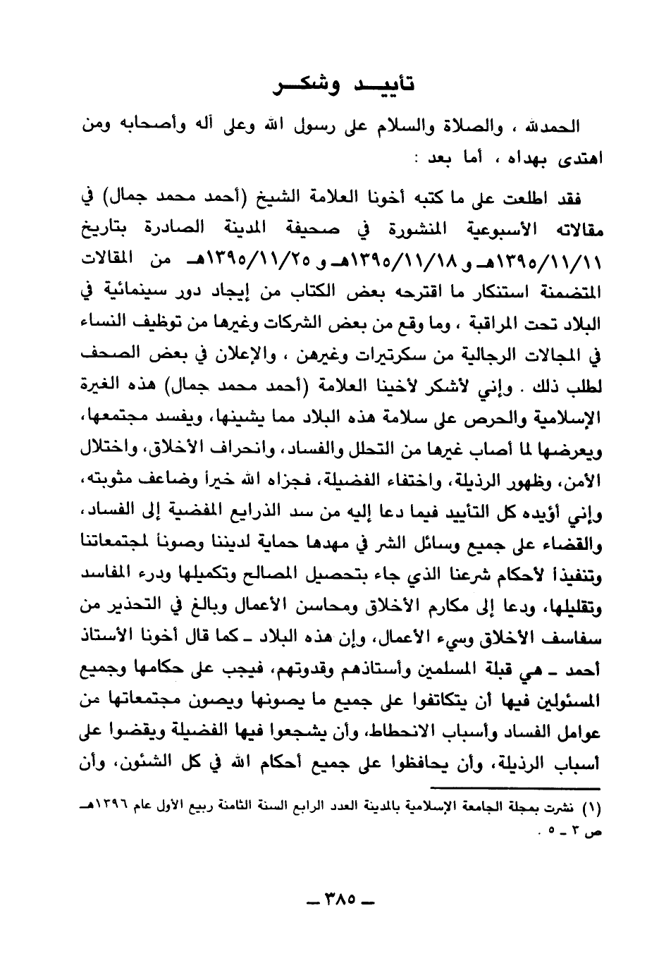 فقد اطلعت على ما كتبه أخونا العلامة الشيخ (أحمد محمد جمال) في مقالاته الأسبوعية المنشورة في صحيفة المدينة الصادرة بتاريخ 11 \ 11 \ 95 هـ و 18 \ 11 \ 1395 هـ و 25 \ 11 \ 95 هـ من المقالات المتضمنة استنكار ما اقترحه بعض الكتاب من إيجاد دور سينمائية في البلاد تحت المراقبة، وما وقع من بعض الشركات وغيرها من توظيف النساء في المجالات الرجالية من سكرتيرات وغيرهن، والإعلان في بعض الصحف لطلب ذلك.