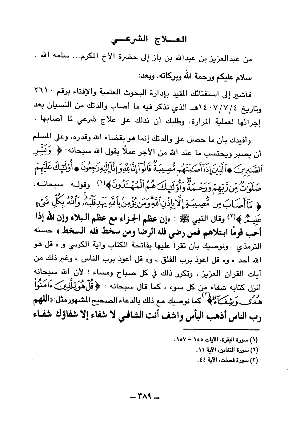من عبد العزيز بن عبد الله بن باز إلى حضرة الأخ المكرم ... سلمه الله. سلام عليكم ورحمة الله وبركاته. وبعد: