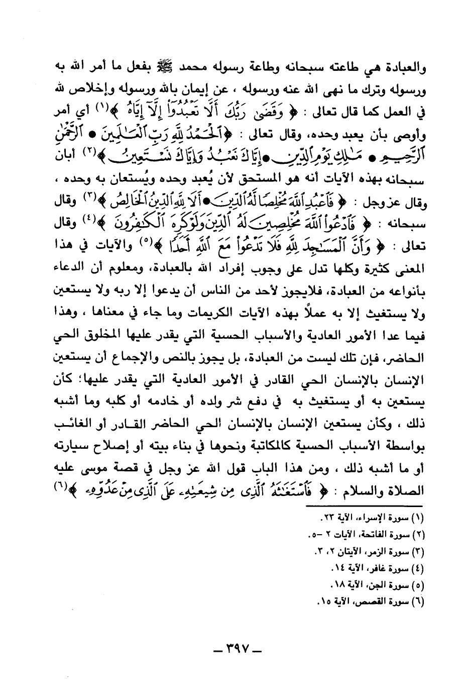 والعبادة هي طاعته سبحانه وطاعة رسوله محمد صلى الله عليه وسلم بفعل ما أمر الله به ورسوله وترك ما نهى الله عنه ورسوله، عن إيمان بالله ورسوله وإخلاص لله في الفعل كما قال تعالى: {وَقَضَى رَبُّكَ أَلَّا تَعْبُدُوا إِلَّا إِيَّاهُ} (¬1) أي أمر وأوصى بأن يعبد وحده، وقال تعالى: {الْحَمْدُ لِلَّهِ رَبِّ الْعَالَمِينَ} (¬2) {الرَّحْمَنِ الرَّحِيمِ} (¬3) {مَالِكِ يَوْمِ الدِّينِ} (¬4) {إِيَّاكَ نَعْبُدُ وَإِيَّاكَ نَسْتَعِينُ} (¬5) أبان سبحانه بهذه الآيات أنه هو المستحق لأن يعبد وحده ويستعان به وحده، وقال عز وجل: {فَاعْبُدِ اللَّهَ مُخْلِصًا لَهُ الدِّينَ} (¬6) {أَلَا لِلَّهِ الدِّينُ الْخَالِصُ} (¬7) وقال سبحانه: {فَادْعُوا اللَّهَ مُخْلِصِينَ لَهُ الدِّينَ وَلَوْ كَرِهَ الْكَافِرُونَ} (¬8) وقال تعالى: {وَأَنَّ الْمَسَاجِدَ لِلَّهِ فَلَا تَدْعُوا مَعَ اللَّهِ أَحَدًا} (¬9) والآيات في هذا المعنى كثيرة، وكلها تدل على وجوب إفراد الله بالعبادة، ومعلوم أن الدعاء بأنواعه من العبادة، فلا يجوز لأحد من الناس أن يدعو إلا ربه ولا يستعين ولا يستغيث إلا به عملا بهذه الآيات الكريمات وما جاء في معناها، وهذا فيما عدا الأمور العادية والأسباب الحسية التي يقدر عليها المخلوق الحي الحاضر، فإن تلك ليست من العبادة، بل يجوز بالنص والإجماع أن يستعين الإنسان بالإنسان الحي القادر في الأمور العادية التي يقدر عليها. كأن يستعين به أو يستغيث به في دفع شر ولده أو خادمه أو كلبه وما أشبه ذلك، وكأن يستعين الإنسان بالإنسان الحي الحاضر القادر أو الغائب بواسطة الأسباب الحسية كالمكاتبة ونحوها في بناء بيته أو إصلاح سيارته أو ما أشبه ذلك.