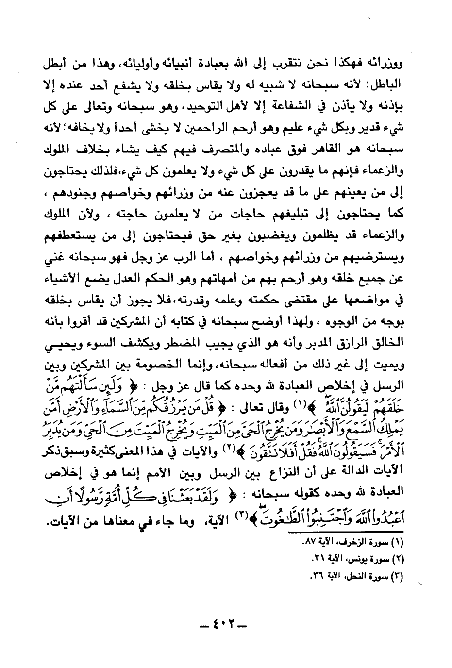 ووزرائه فهكذا نحن نتقرب إلى الله بعبادة أنبيائه وأوليائه، وهذا من أبطل الباطل؛ لأنه سبحانه لا شبيه له ولا يقاس بخلقه ولا يشفع أحد عنده إلا بإذنه ولا يأذن في الشفاعة إلا لأهل التوحيد، وهو سبحانه وتعالى على كل شيء قدير وبكل شيء عليم وهو أرحم الراحمين لا يخشى أحدا ولا يخافه؛ لأنه سبحانه هو القاهر فوق عباده والمتصرف فيهم كيف يشاء، بخلاف الملوك والزعماء فإنهم ما يقدرون على كل شيء ولا يعلمون كل شيء، فلذلك يحتاجون إلى من يعينهم على ما قد يعجزون عنه من وزرائهم وخواصهم وجنودهم، كما يحتاجون إلى تبليغهم حاجات من لا يعلمون حاجته، ولأن الملوك والزعماء قد يظلمون ويغضبون بغير حق فيحتاجون إلى من يستعطفهم ويسترضيهم من وزرائهم وخواصهم، أما الرب عز وجل فهو سبحانه غني عن جميع خلقه وهو أرحم بهم من أمهاتهم وهو الحكم العدل يضع الأشياء في مواضعها على مقتضى حكمته وعلمه وقدرته، فلا يجوز أن يقاس بخلقه بوجه من الوجوه، ولهذا أوضح سبحانه في كتابه أن المشركين قد أقروا بأنه الخالق الرازق المدبر، وأنه هو الذي يجيب المضطر ويكشف السوء ويحيي ويميت إلى غير ذلك من أفعاله سبحانه، وإنما الخصومة بين المشركين وبين الرسل في إخلاص العبادة لله وحده كما قال عز وجل: {وَلَئِنْ سَأَلْتَهُمْ مَنْ خَلَقَهُمْ لَيَقُولُنَّ اللَّهُ} (¬1) وقال تعالى: {قُلْ مَنْ يَرْزُقُكُمْ مِنَ السَّمَاءِ وَالْأَرْضِ أَمَّنْ يَمْلِكُ السَّمْعَ وَالْأَبْصَارَ وَمَنْ يُخْرِجُ الْحَيَّ مِنَ الْمَيِّتِ وَيُخْرِجُ الْمَيِّتَ مِنَ الْحَيِّ وَمَنْ يُدَبِّرُ الْأَمْرَ فَسَيَقُولُونَ اللَّهُ فَقُلْ أَفَلَا تَتَّقُونَ} (¬2) والآيات في هذا المعنى كثيرة وسبق ذكر الآيات الدالة على أن النزاع بين الرسل وبين الأمم إنما هو في إخلاص العبادة لله وحده كقوله سبحانه: {وَلَقَدْ بَعَثْنَا فِي كُلِّ أُمَّةٍ رَسُولًا أَنِ اُعْبُدُوا اللَّهَ وَاجْتَنِبُوا الطَّاغُوتَ} (¬3) الآية، وما جاء في معناها من الآيات.