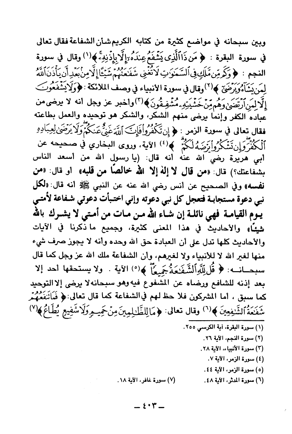 وبين سبحانه في مواضع كثيرة من كتابه الكريم شأن الشفاعة فقال تعالى في سورة البقرة: {مَنْ ذَا الَّذِي يَشْفَعُ عِنْدَهُ إِلَّا بِإِذْنِهِ} (¬1) وقال في سورة النجم: {وَكَمْ مِنْ مَلَكٍ فِي السَّمَاوَاتِ لَا تُغْنِي شَفَاعَتُهُمْ شَيْئًا إِلَّا مِنْ بَعْدِ أَنْ يَأْذَنَ اللَّهُ لِمَنْ يَشَاءُ وَيَرْضَى} (¬2) وقال في سورة الأنبياء في وصف الملائكة: {وَلَا يَشْفَعُونَ إِلَّا لِمَنِ ارْتَضَى وَهُمْ مِنْ خَشْيَتِهِ مُشْفِقُونَ} (¬3) وأخبر عز وجل أنه لا يرضى من عباده الكفر وإنما يرضى منهم الشكر، والشكر هو توحيده والعمل بطاعته فقال تعالى في سورة الزمر: {إِنْ تَكْفُرُوا فَإِنَّ اللَّهَ غَنِيٌّ عَنْكُمْ وَلَا يَرْضَى لِعِبَادِهِ الْكُفْرَ وَإِنْ تَشْكُرُوا يَرْضَهُ لَكُمْ} (¬4) الآية، وروى البخاري في صحيحه عن أبي هريرة رضي الله عنه أنه قال: «يا رسول الله من أسعد الناس بشفاعتك؟ قال: " من قال لا إله إلا الله خالصا من قلبه " أو قال: " من نفسه (¬5) » وفي الصحيح عن أنس رضي الله عنه عن النبي صلى الله عليه وسلم أنه قال: «لكل نبي دعوة مستجابة فتعجل كل نبي دعوته وإني اختبأت دعوتي شفاعة لأمتي يوم القيامة فهي نائلة إن شاء الله من مات من أمتي لا يشرك بالله شيئا (¬6) » والأحاديث في هذا المعنى كثيرة، وجميع ما ذكرنا في الآيات والأحاديث كلها تدل على أن العبادة حق الله وحده وأنه لا يجوز صرف شيء منها لغير الله لا للأنبياء ولا لغيرهم، وأن الشفاعة ملك الله عز وجل كما قال سبحانه: {قُلْ لِلَّهِ الشَّفَاعَةُ جَمِيعًا} (¬7) الآية.
