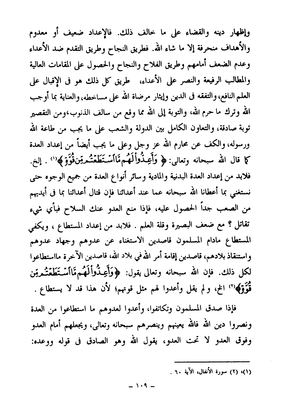 وإظهار دينه والقضاء على ما خالف ذلك. فالإعداد ضعيف أو معدوم والأهداف منحرفة إلا ما شاء الله. فطريق النجاح وطريق التقدم ضد الأعداء وعدم الضعف أمامهم وطريق الفلاح والنجاح والحصول على المقامات العالية والمطالب الرفيعة والنصر على الأعداء - طريق كل ذلك هو في الاقبال على العلم النافع والتفقه في الدين وإيثار مرضاة الله على مساخطه والعناية بما أوجب الله وترك ما حرم الله والتوبة إلى الله مما وقع من سالف الذنوب ومن التقصير توبة صادقة والتعاون الكامل بين الدولة والشعب على ما يجب من طاعة الله ورسوله والكف عن محارم الله عز وجل وعلى ما يجب أيضا من إعداد العدة كما قال الله سبحانه وتعالى {وَأَعِدُّوا لَهُمْ مَا اسْتَطَعْتُمْ مِنْ قُوَّةٍ} (¬1) إلخ.