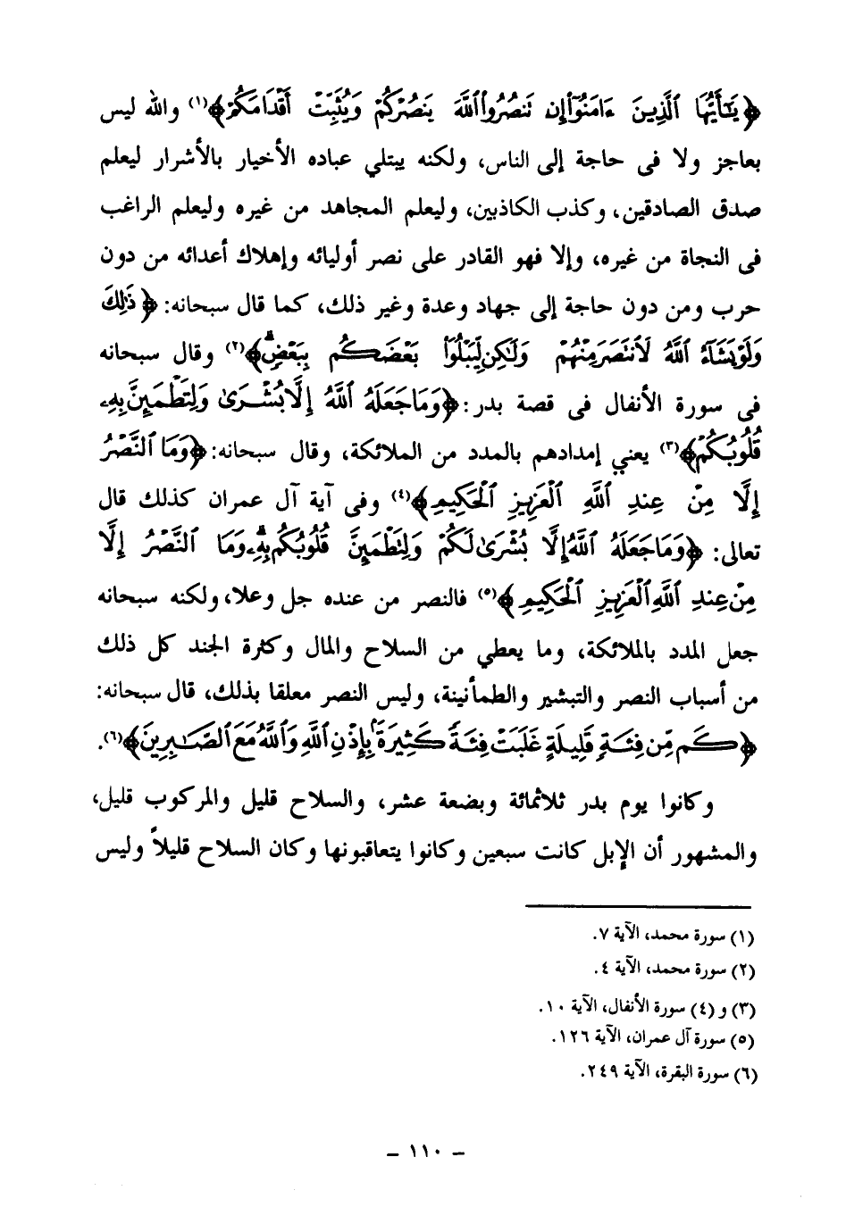 وقال سبحانه في سورة الأنفال في قصة بدر: {وَمَا جَعَلَهُ اللَّهُ إِلَّا بُشْرَى وَلِتَطْمَئِنَّ بِهِ قُلُوبُكُمْ} (¬3) يعني إمدادهم بالمدد من الملائكة، وقال سبحانه {وَمَا النَّصْرُ إِلَّا مِنْ عِنْدِ اللَّهِ الْعَزِيزِ الْحَكِيمِ} (¬4) وفي آية آل عمران كذلك قال تعالى: {وَمَا جَعَلَهُ اللَّهُ إِلَّا بُشْرَى لَكُمْ وَلِتَطْمَئِنَّ قُلُوبُكُمْ بِهِ وَمَا النَّصْرُ إِلَّا مِنْ عِنْدِ اللَّهِ الْعَزِيزِ الْحَكِيمِ} (¬5) فالنصر من عنده جل وعلا، ولكنه سبحانه جعل المدد بالملائكة، وما يعطي من السلاح والمال وكثرة الجند كل ذلك من أسباب النصر والتبشير والطمأنينة، وليس النصر معلقا بذلك، قال سبحانه {كَمْ مِنْ فِئَةٍ قَلِيلَةٍ غَلَبَتْ فِئَةً كَثِيرَةً بِإِذْنِ اللَّهِ وَاللَّهُ مَعَ الصَّابِرِينَ} (¬6)