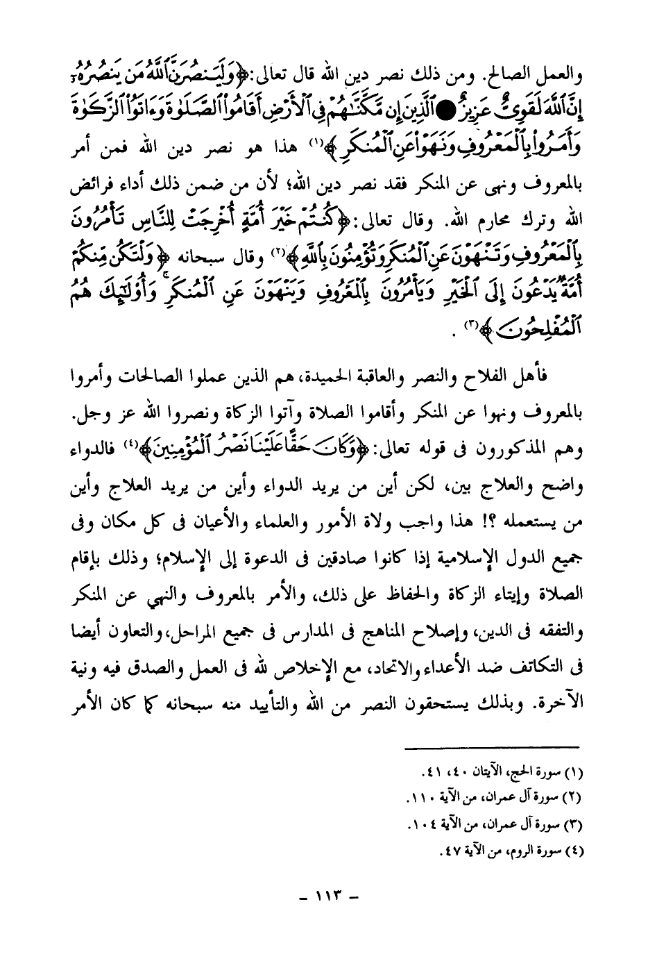 ومن ذلك نصر دين الله قال تعالى: {وَلَيَنْصُرَنَّ اللَّهُ مَنْ يَنْصُرُهُ إِنَّ اللَّهَ لَقَوِيٌّ عَزِيزٌ} (¬1) {الَّذِينَ إِنْ مَكَّنَّاهُمْ فِي الْأَرْضِ أَقَامُوا الصَّلَاةَ وَآتَوُا الزَّكَاةَ وَأَمَرُوا بِالْمَعْرُوفِ وَنَهَوْا عَنِ الْمُنْكَرِ} (¬2) هذا هو نصر دين الله فمن أمر بالمعروف ونهى عن المنكر فقد نصر دين الله؛ لأن من ضمن ذلك أداء فرائض الله وترك محارم الله. وقال تعالى: {كُنْتُمْ خَيْرَ أُمَّةٍ أُخْرِجَتْ لِلنَّاسِ تَأْمُرُونَ بِالْمَعْرُوفِ وَتَنْهَوْنَ عَنِ الْمُنْكَرِ وَتُؤْمِنُونَ بِاللَّهِ} (¬3) وقال سبحانه {وَلْتَكُنْ مِنْكُمْ أُمَّةٌ يَدْعُونَ إِلَى الْخَيْرِ وَيَأْمُرُونَ بِالْمَعْرُوفِ وَيَنْهَوْنَ عَنِ الْمُنْكَرِ وَأُولَئِكَ هُمُ الْمُفْلِحُونَ} (¬4) فأهل الفلاح والنصر والعاقبة الحميدة هم الذين عملوا الصالحات وأمروا بالمعروف ونهوا عن المنكر وأقاموا الصلاة وآتوا الزكاة ونصروا الله عز وجل. وهم المذكورون في قوله تعالى: {وَكَانَ حَقًّا عَلَيْنَا نَصْرُ الْمُؤْمِنِينَ} (¬5) فالدواء واضح والعلاج بين، لكن أين من يريد الدواء وأين من يريد العلاج وأين من يستعمله؟! هذا واجب ولاة الأمور والعلماء والأعيان في كل مكان وفي جميع الدول الإسلامية إذا كانوا صادقين في الدعوة إلى الإسلام؛ وذلك بإقام الصلاة وإيتاء الزكاة والحفاظ على ذلك والأمر بالمعروف والنهي عن المنكر والتفقه في الدين وإصلاح المناهج في المدارس في جميع المراحل والتعاون أيضا في التكاتف ضد الأعداء والاتحاد مع الإخلاص لله في العمل والصدق فيه ونية الآخرة.