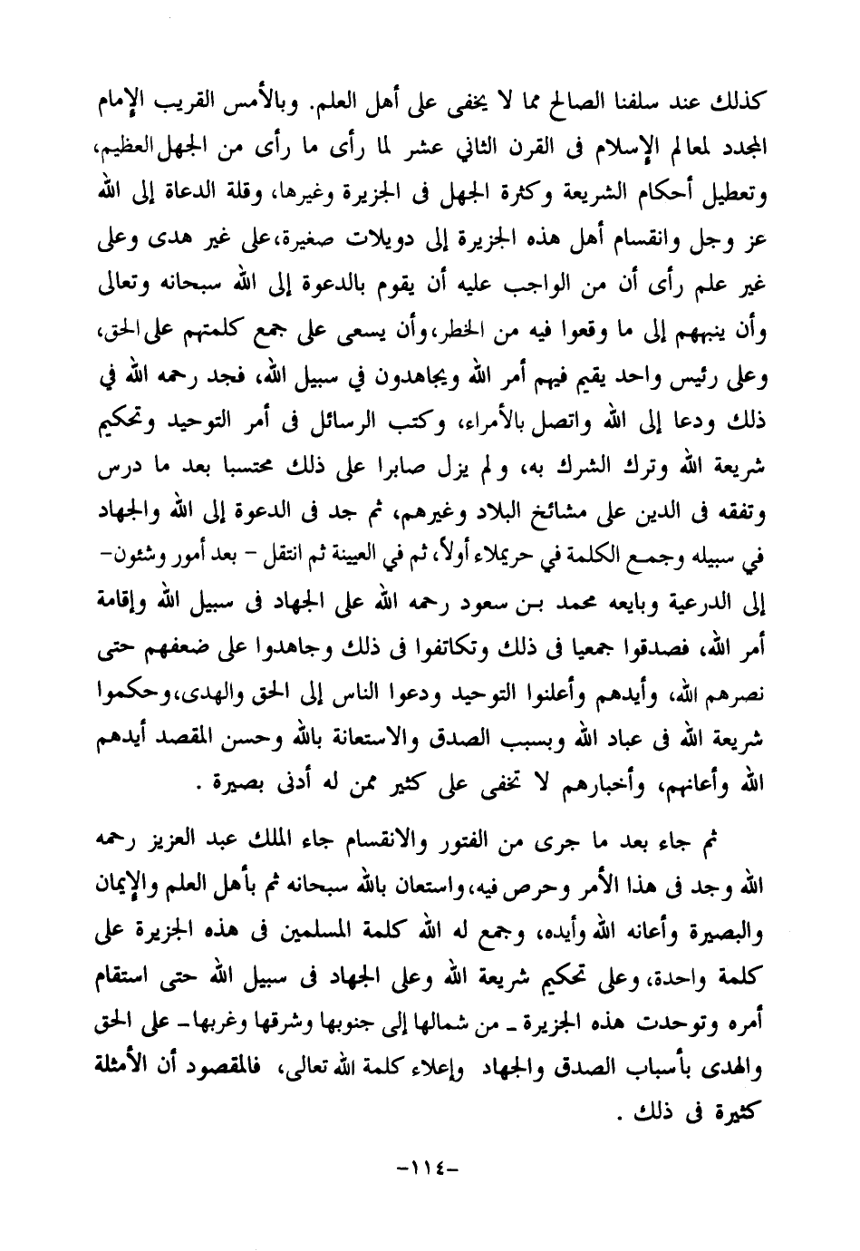 كذلك عند سلفنا الصالح مما لا يخفى على أهل العلم. وبالأمس القريب الإمام المجدد لمعالم الإسلام في القرن الثاني عشر لما رأى ما رأى من الجهل العظيم وتعطيل أحكام الشريعة وكثرة الجهل في الجزيرة وغيرها وقلة الدعاة إلى الله عز وجل وانقسام أهل هذه الجزيرة إلى دويلات صغيرة على غير هدى وعلى غير علم.
