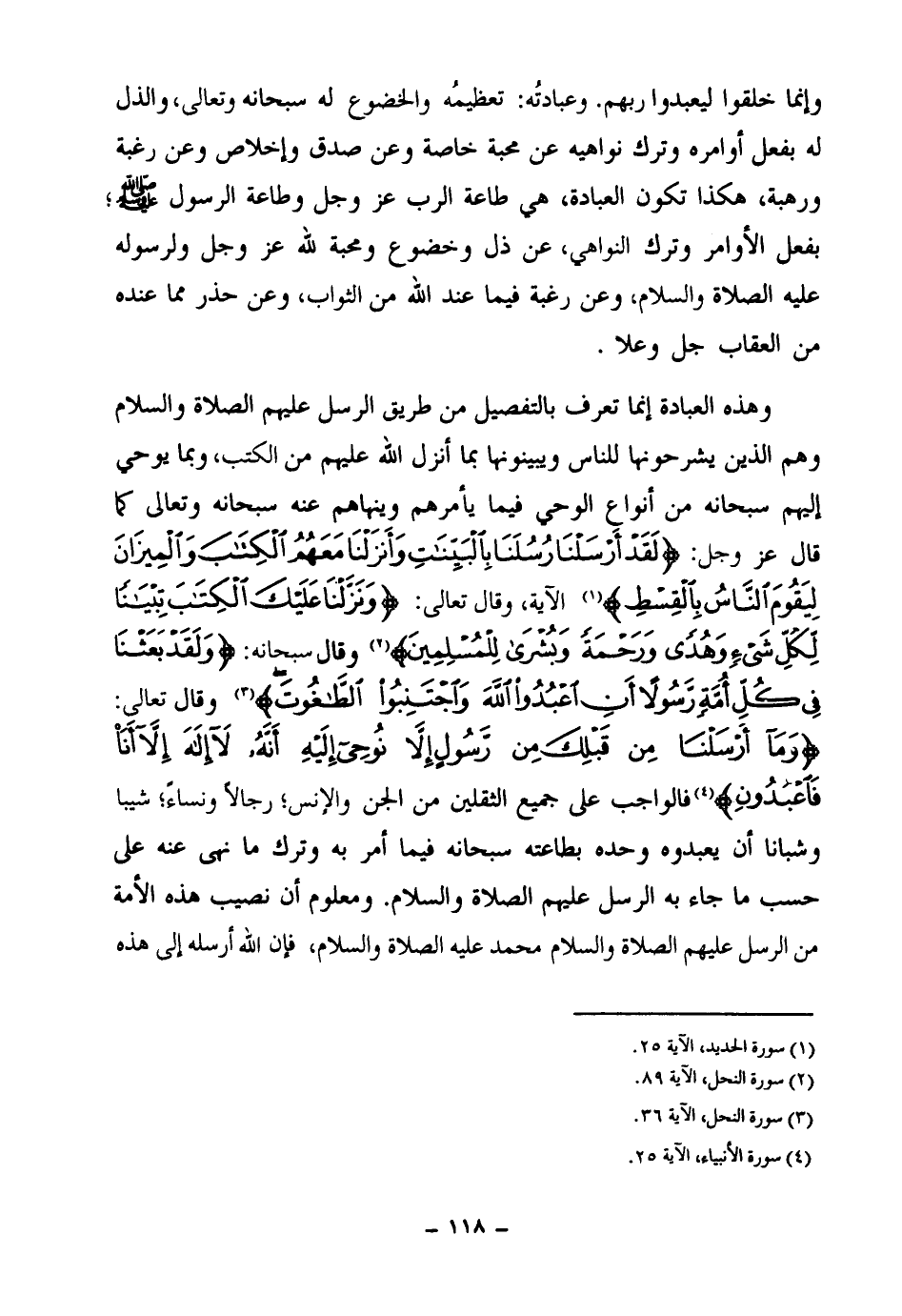 وهذه العبادة إنما تعرف بالتفصيل من طريق الرسل عليهم الصلاة والسلام وهم الذين يشرحونها للناس ويبينونها بما أنزل الله عليهم من الكتاب وبما يوحي إليهم سبحانه من أنواع الوحي فيما يأمرهم وينهاهم عنه سبحانه وتعالى كما قال عز وجل {لَقَدْ أَرْسَلْنَا رُسُلَنَا بِالْبَيِّنَاتِ وَأَنْزَلْنَا مَعَهُمُ الْكِتَابَ وَالْمِيزَانَ لِيَقُومَ النَّاسُ بِالْقِسْطِ} (¬1) الآية، وقال تعالى {وَنَزَّلْنَا عَلَيْكَ الْكِتَابَ تِبْيَانًا لِكُلِّ شَيْءٍ وَهُدًى وَرَحْمَةً وَبُشْرَى لِلْمُسْلِمِينَ} (¬2) وقال سبحانه {وَلَقَدْ بَعَثْنَا فِي كُلِّ أُمَّةٍ رَسُولًا أَنِ اُعْبُدُوا اللَّهَ وَاجْتَنِبُوا الطَّاغُوتَ} (¬3) وقال تعالى {وَمَا أَرْسَلْنَا مِنْ قَبْلِكَ مِنْ رَسُولٍ إِلَّا نُوحِي إِلَيْهِ أَنَّهُ لَا إِلَهَ إِلَّا أَنَا فَاعْبُدُونِ} (¬4) فالواجب على جميع الثقلين من الجن والإنس رجالا ونساء شيبا وشبانا أن يعبدوه وحده بطاعته سبحانه فيما أمر به وترك ما نهى عنه على حسب ما جاء به الرسل عليهم الصلاة والسلام.