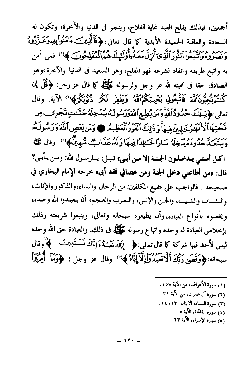 أجمعين، فبذلك يفلح العبد غاية الفلاح وينجو في الدنيا والآخرة، وتكون له السعادة والعاقبة الحميدة الأبدية كما قال تعالى: {فَالَّذِينَ آمَنُوا بِهِ وَعَزَّرُوهُ وَنَصَرُوهُ وَاتَّبَعُوا النُّورَ الَّذِي أُنْزِلَ مَعَهُ أُولَئِكَ هُمُ الْمُفْلِحُونَ} (¬1) فمن آمن به واتبع طريقه وانقاد لشرعه فهو المفلح وهو السعيد في الدنيا والآخرة وهو الصادق حقا في محبته لله عز وجل ولرسوله صلى الله عليه وسلم كما قال عز وجل {قُلْ إِنْ كُنْتُمْ تُحِبُّونَ اللَّهَ فَاتَّبِعُونِي يُحْبِبْكُمُ اللَّهُ وَيَغْفِرْ لَكُمْ ذُنُوبَكُمْ} (¬2) الآية.