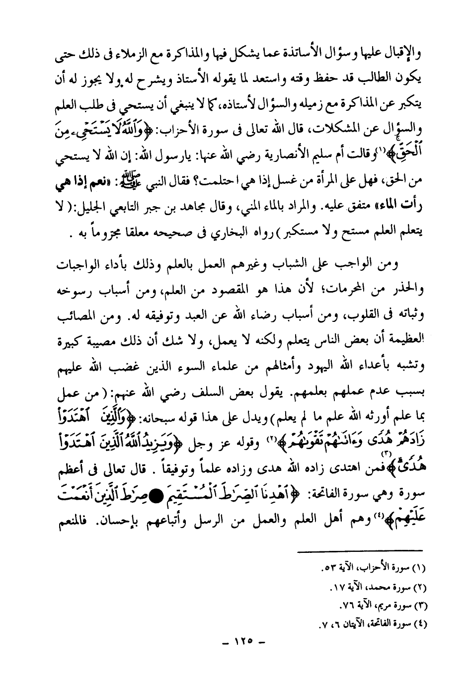 والإقبال عليها وسؤال الأساتذة عما يشكل فيها والمذاكرة مع الزملاء في ذلك حتى يكون الطالب قد حفظ وقته واستعد لما يقوله الأستاذ ويشرح له ولا يجوز له أن يتكبر عن المذاكرة مع زميله والسؤال لأستاذه، كما لا ينبغي أن يستحي في طلب العلم والسؤال عن المشكلات، قال الله تعالى في سورة الأحزاب {وَاللَّهُ لَا يَسْتَحْيِي مِنَ الْحَقِّ} (¬1) وقالت أم سليم الأنصارية رضي الله عنها: «يا رسول الله إن الله لا يستحي من الحق فهل على المرأة من غسل إذا هي احتلمت؟ فقال النبي صلى الله عليه وسلم: نعم إذا هي رأت الماء (¬2) » متفق عليه. والمراد بالماء: المني، وقال مجاهد بن جبر التابعي الجليل: لا يتعلم العلم مستح ولا مستكبر رواه البخاري في صحيحه معلقا مجزوما به.