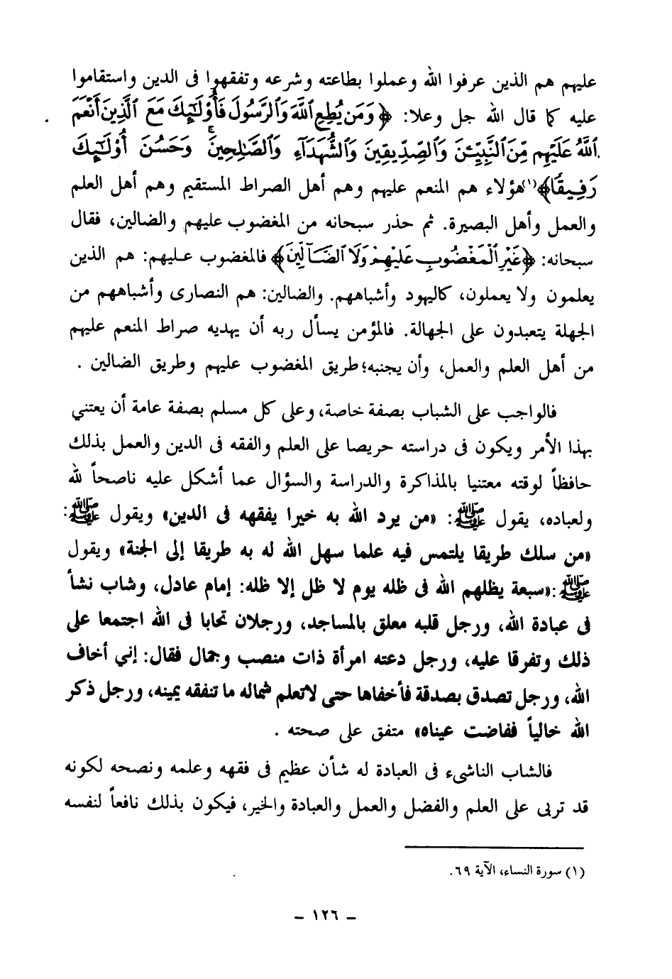فالواجب على الشباب بصفة خاصة وعلى كل مسلم بصفة عامة أن يعتني بهذا الأمر ويكون في دراسته حريصا على العلم والفقه في الدين والعمل بذلك حافظا لوقته معتنيا بالمذاكرة والدراسة والسؤال عما أشكل عليه ناصحا لله ولعباده، يقول صلى الله عليه وسلم: «من يرد الله به خيرا يفقهه في الدين (¬3) » ويقول صلى الله عليه وسلم «من سلك طريقا يلتمس فيه علما سهل الله له به طريقا إلى الجنة (¬4) » ويقول صلى الله عليه وسلم «سبعة يظلهم الله في ظله يوم لا ظل إلا ظله إمام عادل، وشاب نشأ في عبادة الله، ورجل قلبه معلق بالمساجد، ورجلان تحابا في الله اجتمعا على ذلك وتفرقا عليه، ورجل دعته امرأة ذات منصب وجمال فقال: إني أخاف الله، ورجل تصدق بصدقة فأخفاها حتى لا تعلم شماله ما تنفقه يمينه، ورجل ذكر الله خاليا ففاضت عيناه (¬5) » متفق على صحته.
