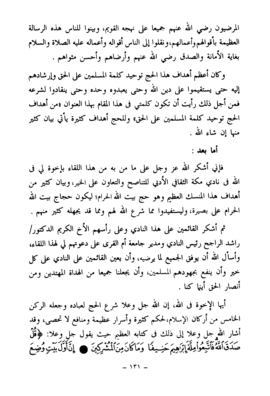 فإني أشكر الله عز وجل على ما من به من هذا اللقاء بإخوة لي في الله في نادي مكة الثقافي الأدبي للتناصح والتعاون على الخير وبيان كثير من أهداف هذا المنسك العظيم وهو حج بيت الله الحرام ليكون حجاج بيت الله الحرام على بصيرة وليستفيدوا مما شرع الله لهم ومما قد يجهله كثير منهم.