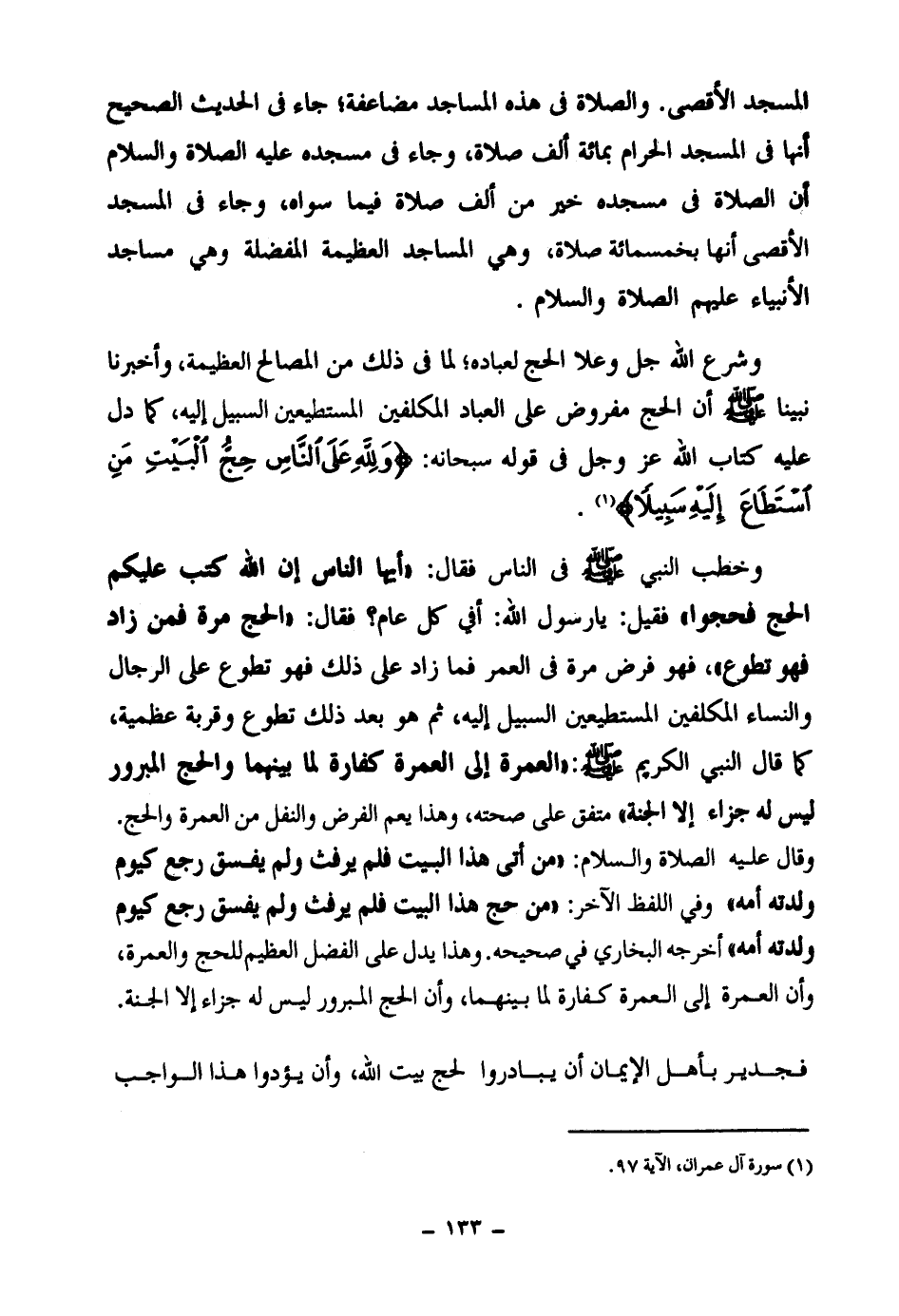 وخطب النبي صلى الله عليه وسلم في الناس فقال: «أيها الناس إن الله كتب عليكم الحج فحجوا. فقيل: يا رسول الله أفي كل عام؟ فقال: الحج مرة فمن زاد فهو تطوع (¬4) » فهو فرض مرة في العمر فما زاد على ذلك فهو تطوع على الرجال والنساء المكلفين المستطيعين السبيل إليه، ثم هو بعد ذلك تطوع وقربة عظيمة، كما قال النبي الكريم صلى الله عليه وسلم «العمرة إلى العمرة كفارة لما بينهما والحج المبرور ليس له جزاء إلا الجنة (¬5) » وهذا يعم الفرض والنفل من العمرة والحج.