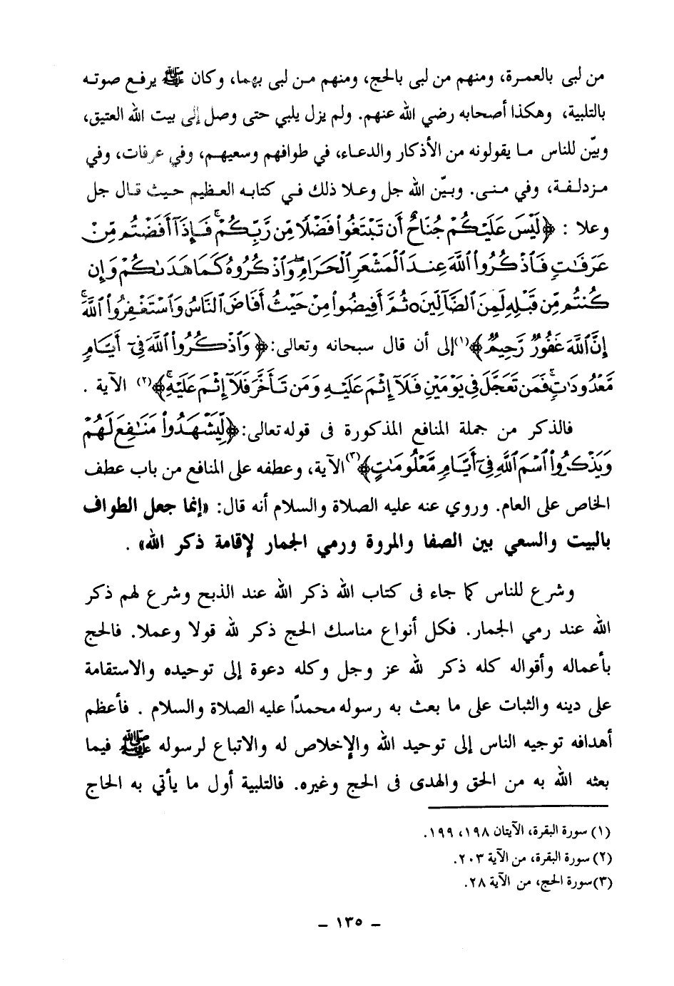 من لبى بالعمرة ومنهم من لبى بهما، وكان صلى الله عليه وسلم يرفع صوته بالتلبية، وهكذا أصحابه رضي الله عنهم. ولم يزل يلبي حتى وصل إلى بيت الله العتيق، وبين للناس ما يقولونه من الأذكار والدعاء في طوافهم وسعيهم وفي عرفات وفي مزدلفة وفي منى. وبين الله جل وعلا ذلك في كتابه العظيم حيث قال جل وعلا: {لَيْسَ عَلَيْكُمْ جُنَاحٌ أَنْ تَبْتَغُوا فَضْلًا مِنْ رَبِّكُمْ فَإِذَا أَفَضْتُمْ مِنْ عَرَفَاتٍ فَاذْكُرُوا اللَّهَ عِنْدَ الْمَشْعَرِ الْحَرَامِ وَاذْكُرُوهُ كَمَا هَدَاكُمْ وَإِنْ كُنْتُمْ مِنْ قَبْلِهِ لَمِنَ الضَّالِّينَ} (¬1) {ثُمَّ أَفِيضُوا مِنْ حَيْثُ أَفَاضَ النَّاسُ وَاسْتَغْفِرُوا اللَّهَ إِنَّ اللَّهَ غَفُورٌ رَحِيمٌ} (¬2) إلى أن قال سبحانه وتعالى {وَاذْكُرُوا اللَّهَ فِي أَيَّامٍ مَعْدُودَاتٍ فَمَنْ تَعَجَّلَ فِي يَوْمَيْنِ فَلَا إِثْمَ عَلَيْهِ وَمَنْ تَأَخَّرَ فَلَا إِثْمَ عَلَيْهِ} (¬3) الآية.
