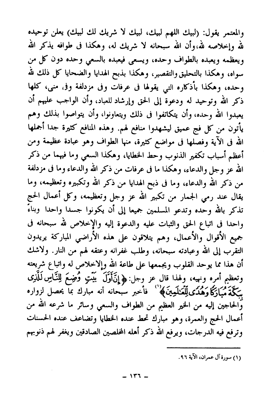 ولا شك أن هذا مما يوحد القلوب ويجمعها على طاعة الله والإخلاص له واتباع شريعته وتعظيم أمره ونهيه، ولهذا قال عز وجل {إِنَّ أَوَّلَ بَيْتٍ وُضِعَ لِلنَّاسِ لَلَّذِي بِبَكَّةَ مُبَارَكًا وَهُدًى لِلْعَالَمِينَ} (¬1) فأخبر سبحانه أنه مبارك بما يحصل لزواره والحاجين إليه من الخير العظيم من الطواف والسعي وسائر ما شرعه الله من أعمال الحج والعمرة وهو مبارك تحط عنده الخطايا وتضاعف عنده الحسنات وترفع فيه الدرجات، ويرفع الله ذكر أهله المخلصين الصادقين ويغفر لهم ذنوبهم