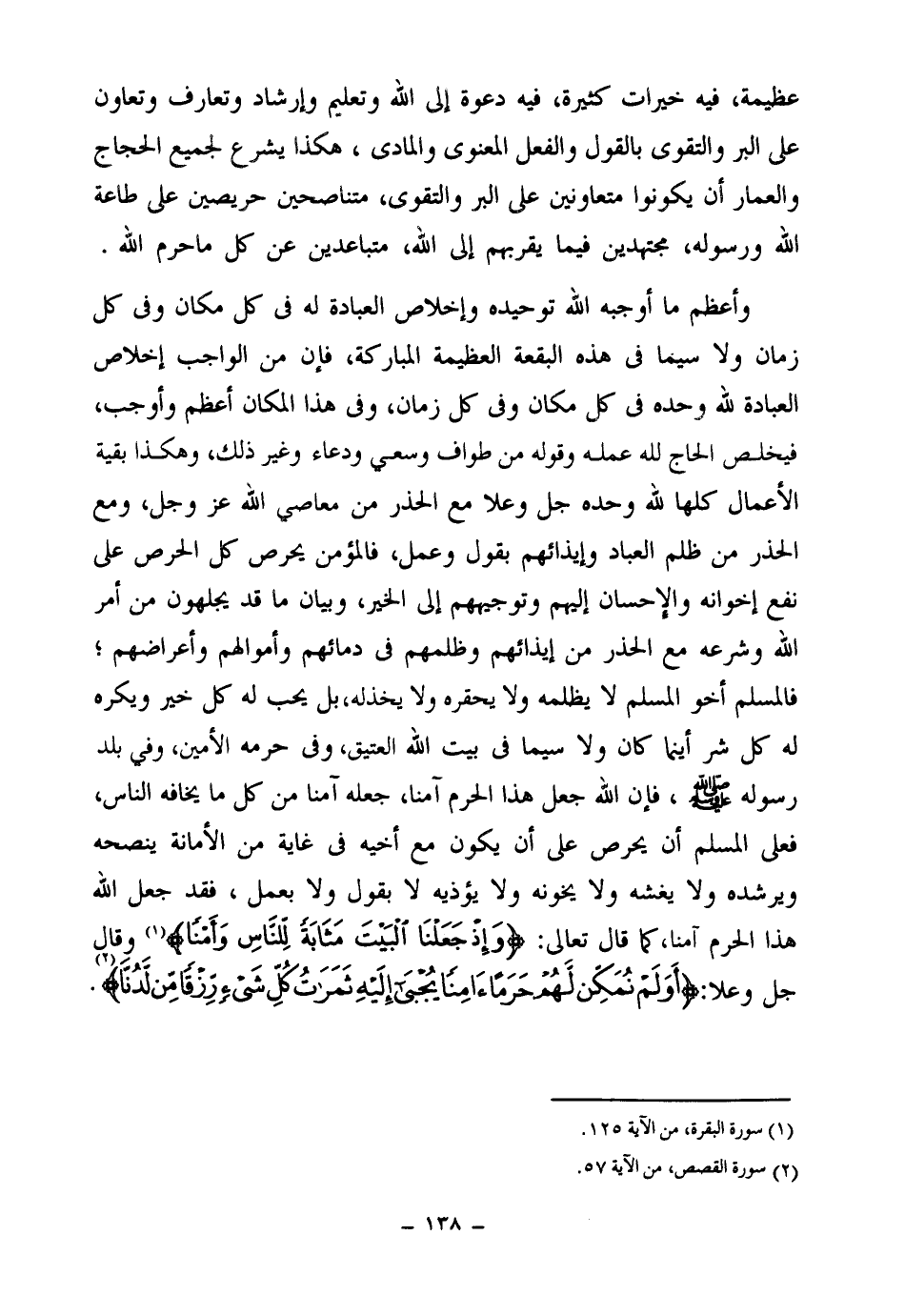 وأعظم ما أوجبه الله توحيده وإخلاص العبادة له في كل مكان وفي كل زمان ولا سيما في هذه البقعة العظيمة المباركة، فإن من الواجب إخلاص العبادة لله وحده في كل مكان وفي كل زمان، وفي هذا المكان أعظم وأوجب، فيخلص لله عملا وقولا من طواف وسعي ودعاء وغير ذلك، وهكذا بقية الأعمال كلها لله وحده جل وعلا مع الحذر من معاصي الله عز وجل، ومع الحذر من ظلم العباد وإيذائهم بقول وعمل، فالمؤمن يحرص كل الحرص على نفع إخوانه والإحسان إليهم وتوجيههم إلى الخير، وبيان ما قد يجلهون من أمر الله وشرعه مع الحذر من إيذائهم وظلمهم في دمائهم وأموالهم وأعراضهم؛ فالمسلم أخو المسلم لا يظلمه ولا يحقره ولا يخذله بل يحب له كل خير ويكره له كل شر أينما كان ولا سيما في بيت الله العتيق وفي حرمه الأمين وفي بلد رسوله صلى الله عليه وسلم، فإن الله جعل هذا الحرم آمنا، جعله آمنا من كل ما يخافه الناس، فعلى المسلم أن يحرص على أن يكون مع أخيه في غاية من الأمانة ينصحه ويرشده ولا يغشه ولا يخونه ولا يؤذيه لا بقول ولا بعمل، فقد جعل الله هذا الحرم آمنا كما قال تعالى: {وَإِذْ جَعَلْنَا الْبَيْتَ مَثَابَةً لِلنَّاسِ وَأَمْنًا} (¬1) وقال جل وعلا: {أَوَلَمْ نُمَكِّنْ لَهُمْ حَرَمًا آمِنًا يُجْبَى إِلَيْهِ ثَمَرَاتُ كُلِّ شَيْءٍ رِزْقًا مِنْ لَدُنَّا} (¬2)