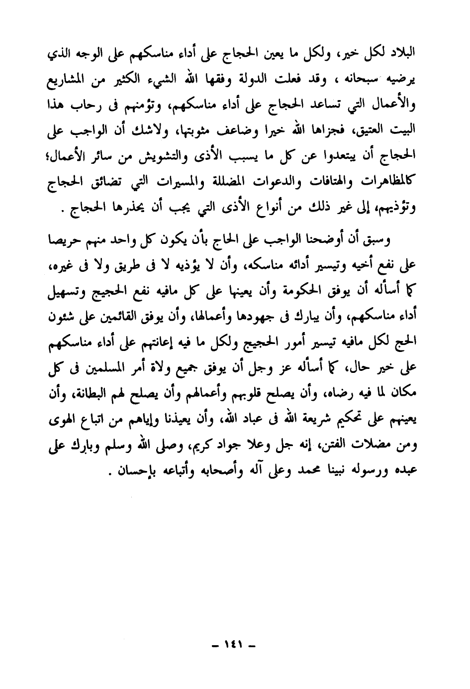 البلاد لكل خير، ولكل ما يعين الحجاج على أداء مناسكهم على الوجه الذي يرضيه سبحانه، وقد فعلت الدولة وفقها الله الشيء الكثير من المشاريع والأعمال التي تساعد الحجاج على أداء مناسكهم، وتؤمنهم في رحاب هذا البيت العتيق، فجزاها الله خيرا وضاعف مثوبتها.