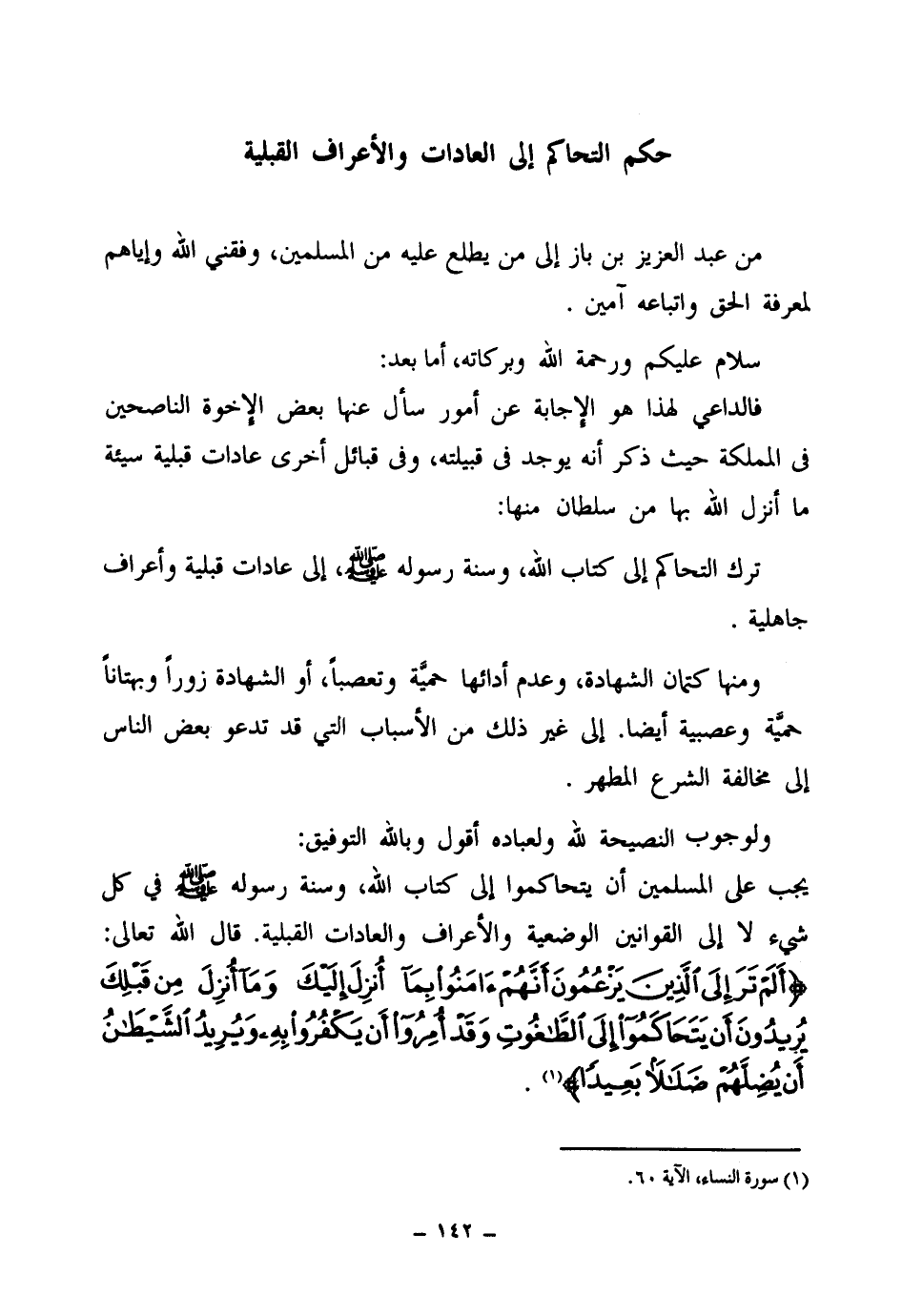 ولوجوب النصيحة لله ولعباده أقول وبالله التوفيق: يجب على المسلمين أن يتحاكموا إلى كتاب الله، وسنة رسوله صلى الله عليه وسلم في كل شيء لا إلى القوانين الوضعية والأعراف والعادات القبلية. قال الله تعالى: {أَلَمْ تَرَ إِلَى الَّذِينَ يَزْعُمُونَ أَنَّهُمْ آمَنُوا بِمَا أُنْزِلَ إِلَيْكَ وَمَا أُنْزِلَ مِنْ قَبْلِكَ يُرِيدُونَ أَنْ يَتَحَاكَمُوا إِلَى الطَّاغُوتِ وَقَدْ أُمِرُوا أَنْ يَكْفُرُوا بِهِ وَيُرِيدُ الشَّيْطَانُ أَنْ يُضِلَّهُمْ ضَلَالًا بَعِيدًا} (¬1)
