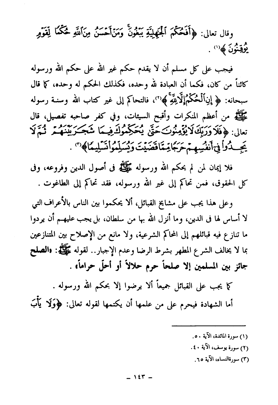 وعلى هذا يجب على مشايخ القبائل، ألا يحكموا بين الناس بالأعراف التي لا أساس لها في الدين، وما أنزل الله بها من سلطان. بل يجب عليهم أن يردوا ما تنازع فيه قبائلهم إلى المحاكم الشرعية، ولا مانع من الإصلاح بين المتنازعين بما لا يخالف الشرع المطهر بشرط الرضا وعدم الإجبار. لقوله صلى الله عليه وسلم: «الصلح جائز بين المسلمين إلا صلحا حرم حلالا أو أحل حراما (¬4) » . كما يجب على القبائل جميعا ألا يرضوا إلا بحكم الله ورسوله.