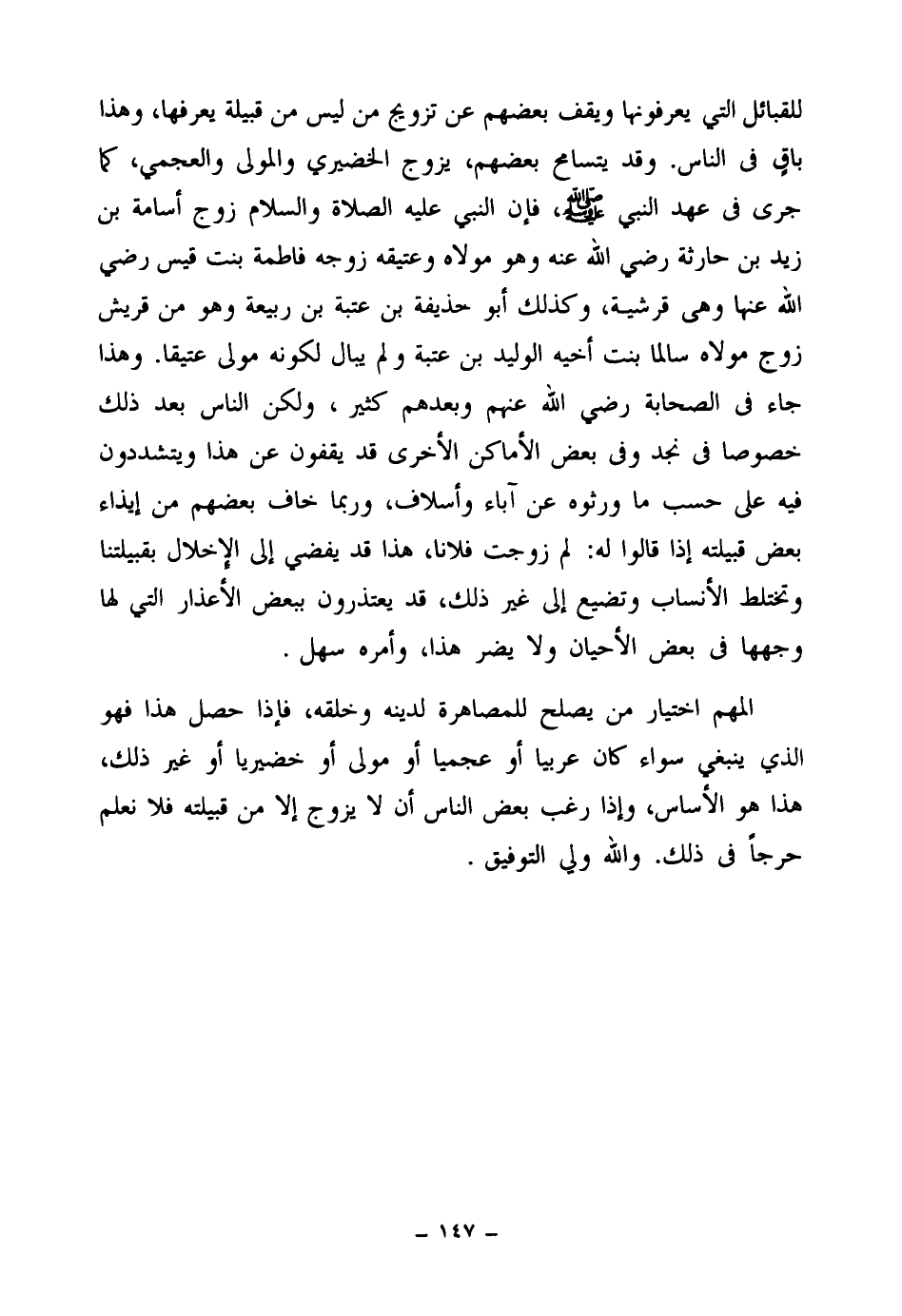 للقبائل التي يعرفونها ويقف بعضهم عن تزوج من ليس من قبيلة يعرفها، وهذا باق في الناس. وقد يتسامح بعضهم، يزوج الخضيري والمولى والعجمي، كما جرى في عهد النبي صلى الله عليه وسلم، فإن النبي عليه الصلاة والسلام زوج أسامة بن زيد بن حارثة رضي الله عنها وهو مولاه وعتيقه زوجه فاطمة بنت قيس رضي الله عنها وهي قرشية، وكذلك أبو حذيفة بن عتبة بن ربيعة وهو من قريش زوج مولاه سالما بنت أخيه الوليد بن عتبة ولم يبال لكونه مولى عتيقا.