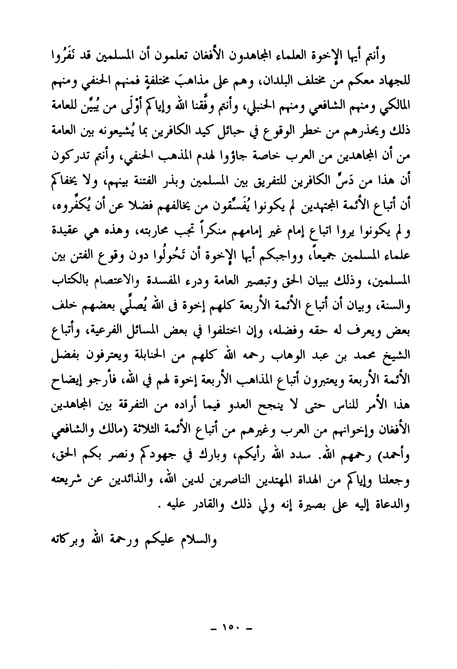 وأنتم أيها الإخوة العلماء المجاهدون الأفغان تعلمون أن المسلمين قد نفروا للجهاد معكم من مختلف البلدان، وهم على مذاهب مختلفة فمنهم الحنفي ومنهم المالكي ومنهم الشافعي ومنهم الحنبلي، وأنتم وفقنا الله وإياكم أولى من يبين للعامة ذلك ويحذرهم من خطر الوقوع في حبائل كيد الكافرين بما يشيعونه بين العامة من أن المجاهدين من العرب خاصة جاءوا لهدم المذهب الحنفي، وأنتم تدركون أن هذا من دس الكافرين للتفريق بين المسلمين وبذر الفتنة بينهم، ولا يخفاكم أن أتباع الأئمة المجتهدين لم يكونوا يفسقون من يخالفهم فضلا عن أن يكفروه، ولم يكونوا يروا اتباع إمام غير إمامهم منكرا تجب محاربته، وهذه هي عقيدة علماء المسلمين جميعا، وواجبكم أيها الإخوة أن تحولوا دون وقوع الفتن بين المسلمين، وذلك ببيان الحق وتبصير العامة ودرء المفسدة والاعتصام بالكتاب والسنة، وبيان أن أتباع الأئمة الأربعة كلهم إخوة في الله يصلي بعضهم خلف بعض ويعرف له حقه وفضله، وإن اختلفوا في بعض المسائل الفرعية، وأتباع الشيخ محمد بن عبد الوهاب رحمه الله كلهم من الحنابلة ويعترفون بفضل الأئمة الأربعة ويعتبرون أتباع المذاهب الأربعة إخوة لهم في الله، فأرجو إيضاح هذا الأمر للناس حتى لا ينجح العدو فيما أراده من التفرقة بين المجاهدين الأفغان وإخوانهم من العرب وغيرهم من أتباع الأئمة الثلاثة (مالك والشافعي وأحمد) رحمهم الله.