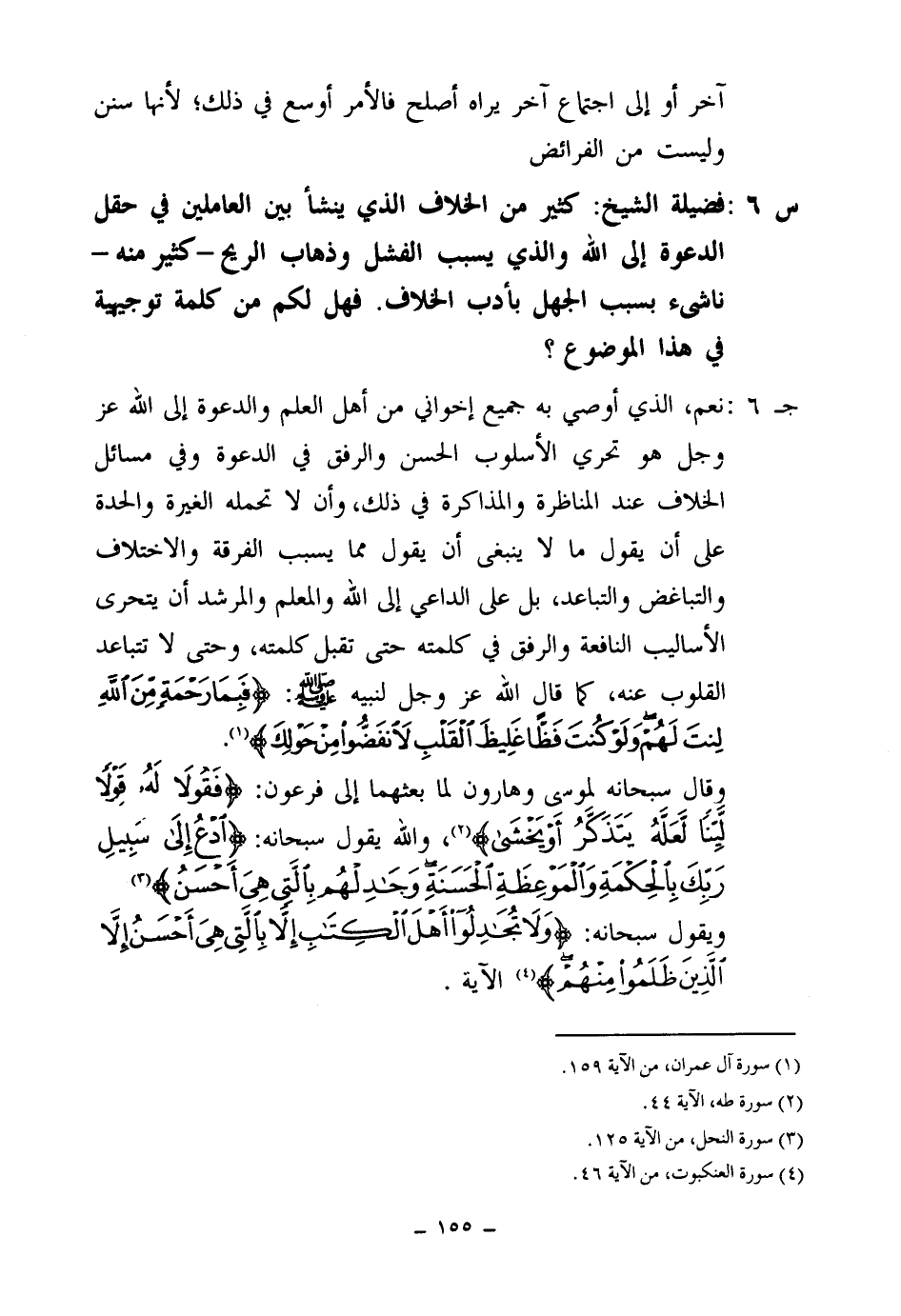 وقال سبحانه لموسى وهارون لما بعثهما إلى فرعون: {فَقُولَا لَهُ قَوْلًا لَيِّنًا لَعَلَّهُ يَتَذَكَّرُ أَوْ يَخْشَى} (¬2) والله يقول سبحانه {ادْعُ إِلَى سَبِيلِ رَبِّكَ بِالْحِكْمَةِ وَالْمَوْعِظَةِ الْحَسَنَةِ وَجَادِلْهُمْ بِالَّتِي هِيَ أَحْسَنُ} (¬3) ويقول سبحانه: {وَلَا تُجَادِلُوا أَهْلَ الْكِتَابِ إِلَّا بِالَّتِي هِيَ أَحْسَنُ إِلَّا الَّذِينَ ظَلَمُوا مِنْهُمْ} (¬4) الآية.