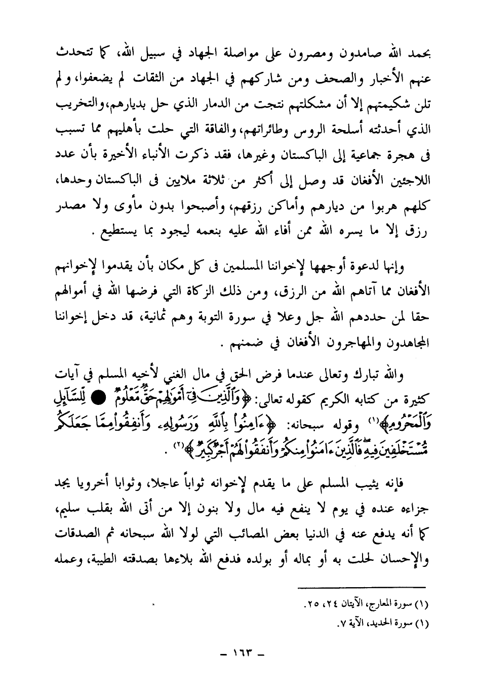 وإنها لدعوة أوجهها لإخواننا المسلمين في كل مكان بأن يقدموا لإخوانهم الأفغان مما آتاهم الله من الرزق، ومن ذلك الزكاة التي فرضها الله في أموالهم حقا لمن حددهم الله جل وعلا في سورة التوبة وهم ثمانية، قد دخل إخواننا المجاهدين والمهاجرون الأفغان في ضمنهم.