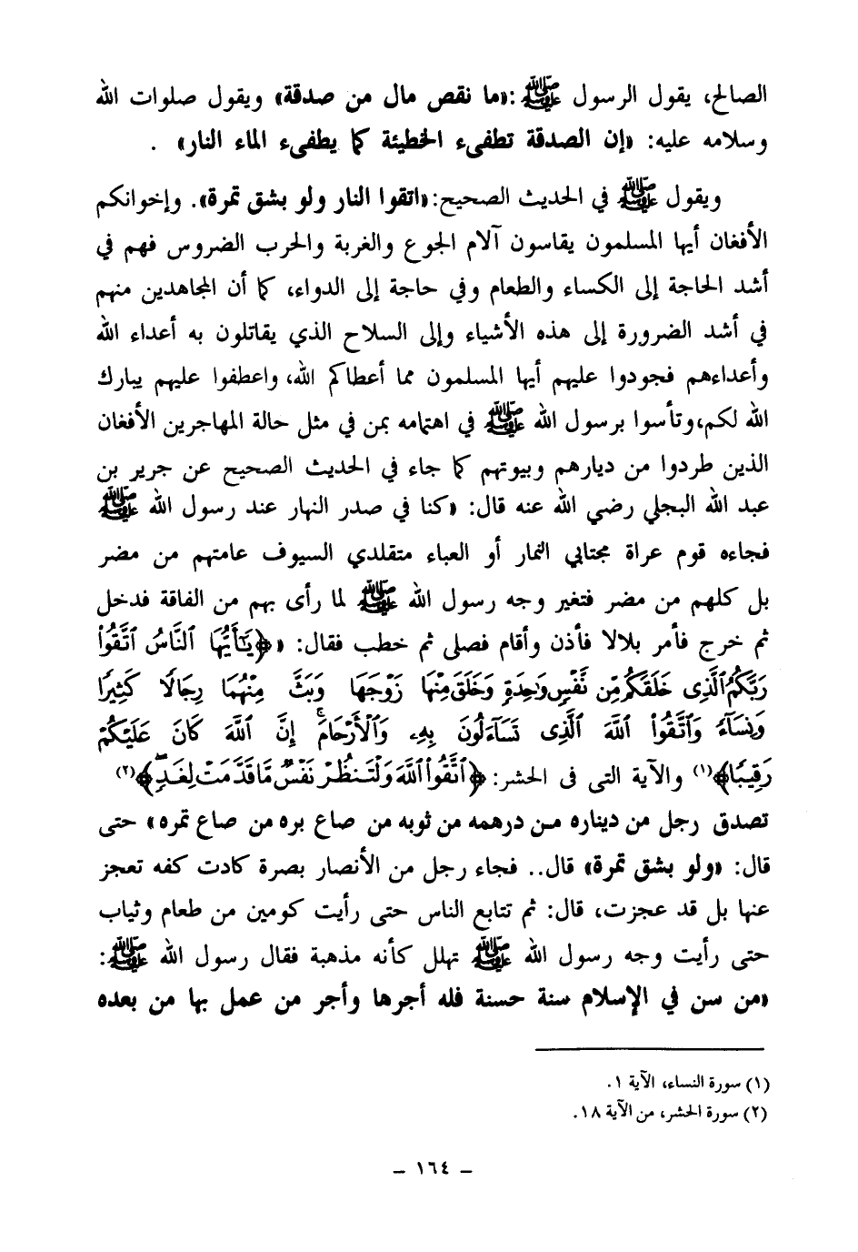 وإخوانكم الأفغان أيها المسلمون يقاسون آلام الجوع والغربة والحرب الضروس فهم في أشد الحاجة إلى الكساء والطعام وفي حاجة إلى الدواء، كما أن المجاهدين منهم في أشد الضرورة إلى هذه الأشياء وإلى السلاح الذي يقاتلون به أعداء الله وأعداءهم فجودوا عليهم أيها المسلمون مما أعطاكم الله وأعطفوا عليهم يبارك الله لكم وتأسوا برسول الله صلى الله عليه وسلم في اهتمامه بمن في مثل حالة المهاجرين الأفغان الذين طردوا من ديارهم وبيوتهم كما جاء في الحديث الصحيح عن جرير بن عبد الله البجلي رضي الله عنه قال: «كنا في صدر النهار عند رسول الله صلى الله عليه وسلم فجاءه قوم عراة مجتابي النمار أو العباء متقلدي السيوف عامتهم من مضر، بل كلهم من مضر فتغير وجه رسول الله صلى الله عليه وسلم لما رأى بهم من الفاقة فدخل ثم خرج فأمر بلالا فأذن وأقام فصلى ثم خطب فقال والآية التي في الحشر