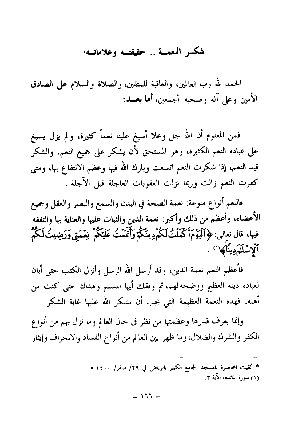 فالنعم أنواع منوعة: نعمة الصحة في البدن والسمع والبصر والعقل وجميع الأعضاء، وأعظم من ذلك وأكبر: نعمة الدين والثبات عليها والعناية بها والتفقه فيها، قال تعالى {الْيَوْمَ أَكْمَلْتُ لَكُمْ دِينَكُمْ وَأَتْمَمْتُ عَلَيْكُمْ نِعْمَتِي وَرَضِيتُ لَكُمُ الْإِسْلَامَ دِينًا} (¬1)