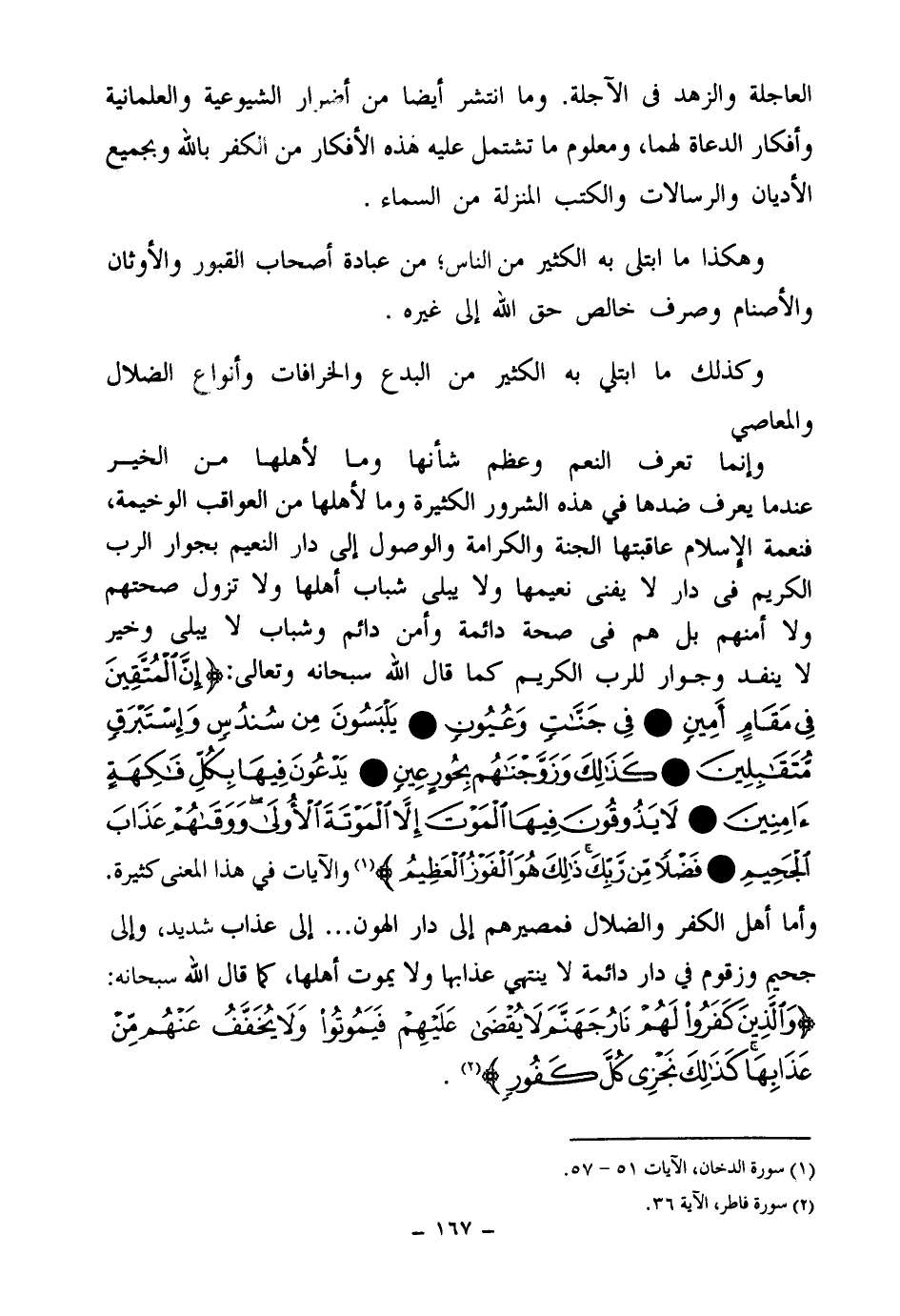 وإنما تعرف النعم وعظم شأنها وما لأهلها من الخير عندما يعرف ضدها في هذه الشرور الكثيرة وما لأهلها من العواقب الوخيمة، فنعمة الإسلام عاقبتها الجنة والكرامة والوصول إلى دار النعيم بجوار الرب الكريم في دار لا يفنى نعيمها، ولا يبلى شباب أهلها، ولا تزول صحتهم ولا أمنهم، بل هم في صحة دائمة وأمن دائم وشباب لا يبلى وخير لا ينفد وجوار للرب الكريم، كما قال الله سبحانه وتعالى: {إِنَّ الْمُتَّقِينَ فِي مَقَامٍ أَمِينٍ} (¬1) {فِي جَنَّاتٍ وَعُيُونٍ} (¬2) {يَلْبَسُونَ مِنْ سُنْدُسٍ وَإِسْتَبْرَقٍ مُتَقَابِلِينَ} (¬3) {كَذَلِكَ وَزَوَّجْنَاهُمْ بِحُورٍ عِينٍ} (¬4) {يَدْعُونَ فِيهَا بِكُلِّ فَاكِهَةٍ آمِنِينَ} (¬5) {لَا يَذُوقُونَ فِيهَا الْمَوْتَ إِلَّا الْمَوْتَةَ الْأُولَى وَوَقَاهُمْ عَذَابَ الْجَحِيمِ} (¬6) {فَضْلًا مِنْ رَبِّكَ ذَلِكَ هُوَ الْفَوْزُ الْعَظِيمُ} (¬7) والآيات في هذا المعنى كثيرة. وأما أهل الكفر والضلال فمصيرهم إلى دار الهون. إلى عذاب شديد وإلى جحيم وزقوم في دار دائمة لا ينتهي عذابها ولا يموت أهلها، كما قال الله سبحانه {وَالَّذِينَ كَفَرُوا لَهُمْ نَارُ جَهَنَّمَ لَا يُقْضَى عَلَيْهِمْ فَيَمُوتُوا وَلَا يُخَفَّفُ عَنْهُمْ مِنْ عَذَابِهَا كَذَلِكَ نَجْزِي كُلَّ كَفُورٍ} (¬8)