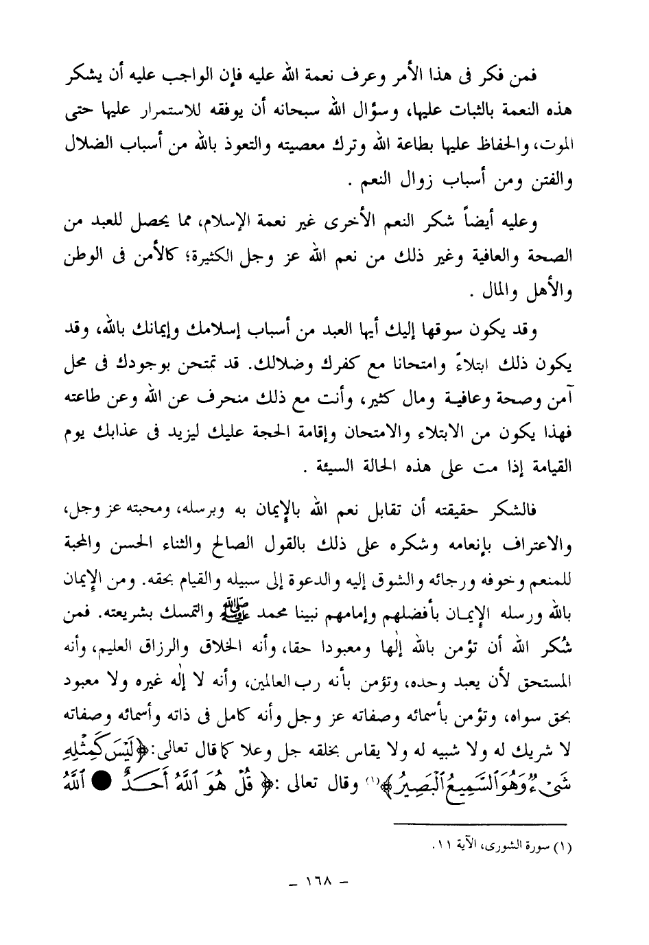 فمن شكر الله أن تؤمن بالله إلها ومعبودا حقا وأنه الخلاق والرزاق العليم وأنه المستحق لأن يعبد وحده وتؤمن بأنه رب العالمين وأنه لا إله غيره ولا معبود بحق سواه، وتؤمن بأسمائه وصفاته عز وجل وأنه كامل في ذاته وأسمائه وصفاته لا شريك له ولا شبيه له ولا يقاس بخلقه جل وعلا كما قال تعالى: {لَيْسَ كَمِثْلِهِ شَيْءٌ وَهُوَ السَّمِيعُ الْبَصِيرُ} (¬1) وقال تعالى: