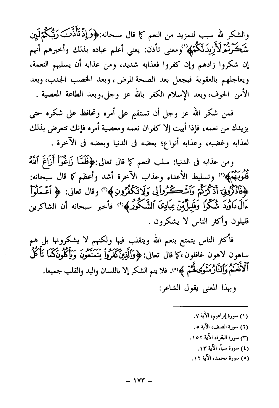ومن عذابه في الدنيا: سلب النعم كما قال تعالى {فَلَمَّا زَاغُوا أَزَاغَ اللَّهُ قُلُوبَهُمْ} (¬2) وتسليط الأعداء وعذاب الآخرة أشد وأعظم كما قال سبحانه: {فَاذْكُرُونِي أَذْكُرْكُمْ وَاشْكُرُوا لِي وَلَا تَكْفُرُونِ} (¬3) وقال تعالى: {اعْمَلُوا آلَ دَاوُدَ شُكْرًا وَقَلِيلٌ مِنْ عِبَادِيَ الشَّكُورُ} (¬4) فأخبر سبحانه أن الشاكرين قليلون وأكثر الناس لا يشكرون.