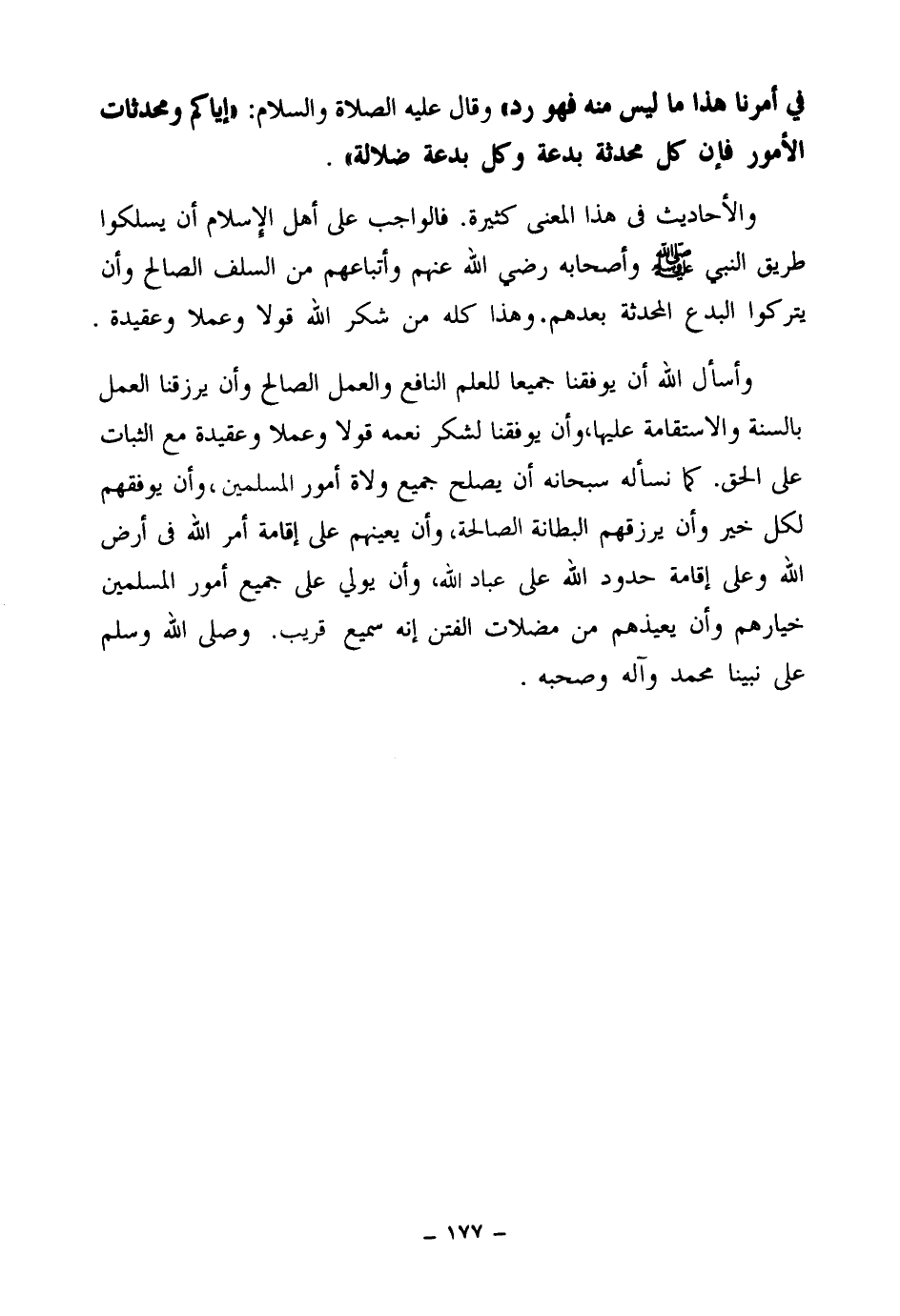 وهذا كله من شكر الله قولا وعملا وعقيدة. وأسأل الله أن يوفقنا جميعا للعلم النافع والعمل الصالح وأن يرزقنا العمل بالسنة والاستقامة عليها وأن يوفقنا لشكر نعمه قولا وعملا وعقيدة مع الثبات على الحق. كما نسأله سبحانه أن يصلح جميع ولاة أمور المسلمين وأن يوفقهم لكل خير وأن يرزقهم البطانة الصالحة وأن يعينهم على إقامة أمر الله في أرض الله وعلى إقامة حدود الله على عباد الله وأن يولي على جميع أمور المسلمين خيارهم وأن يعيذهم من مضلات الفتن إنه سميع قريب. وصلى الله وسلم على نبينا محمد وآله وصحبه.