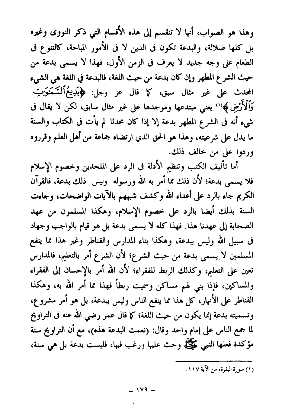 أما تأليف الكتب وتنظيم الأدلة في الرد على الملحدين وخصوم الإسلام فلا يسمى بدعة؛ لأن ذلك مما أمر به الله ورسوله وليست ذلك بدعة، فالقرآن الكريم جاء بالرد على أعداء الله وكشف شبههم بالآيات الواضحات، وجاءت السنة بذلك أيضا بالرد على خصوم الإسلام، وهكذا المسلمون من عهد الصحابة إلى عهدنا هذا. فهذا كله لا يسمى بدعة بل هو قيام بالواجب وجهاد في سبيل الله وليس ببدعة، وهكذا بناء المدارس والقناطر وغير هذا مما ينفع المسلمين لا يسمى بدعة من حيث الشرع؛ لأن الشرع أمر بالتعليم، فالمدارس تعين على التعليم، وكذلك الربط للفقراء؛ لأن الله أمر بالإحسان إلى الفقراء والمساكن، فإذا بني لهم مساكن وسميت ربطا فهذا مما أمر الله به، وهكذا القناطر على الأنهار، كل هذا مما ينفع الناس وليس ببدعة، بل هو أمر مشروع، وتسميته بدعة إنما يكون من حيث اللغة؛ كما قال عمر رضي الله عنه في التراويح لما جمع الناس على إمام واحد وقال: (نعمت البدعة هذه) ، مع أن التراويح سنة مؤكدة فعلها النبي صلى الله عليه وسلم وحث عليها ورغب فيها، فليست بدعة بل هي سنة
