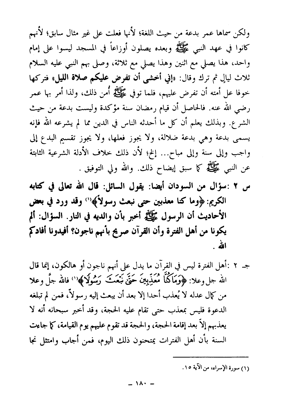 س2: سؤال من السودان أيضا: يقول السائل: قال الله تعالى في كتابه الكريم {وَمَا كُنَّا مُعَذِّبِينَ حَتَّى نَبْعَثَ رَسُولًا} (¬2) وقد ورد في بعض الأحاديث أن الرسول صلى الله عليه وسلم أخبر بأن والديه في النار. السؤال: ألم يكونا من أهل الفترة وأن القرآن صريح بأنهم ناجون؟ أفيدونا أفادكم الله.