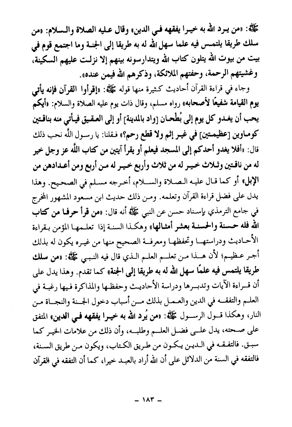 صلى الله عليه وسلم: «من يرد الله به خيرا يفقهه في الدين (¬1) » ، وقال عليه السلام: «من سلك طريقا يلتمس فيه علما سهل الله له به طريقا إلى الجنة وما اجتمع قوم في بيت من بيوت الله يتلون كتاب الله ويتدارسونه بينهم إلا نزلت عليهم السكينة وغشيتهم الرحمة وحفتهم الملائكة وذكرهم الله فيمن عنده (¬2) » .