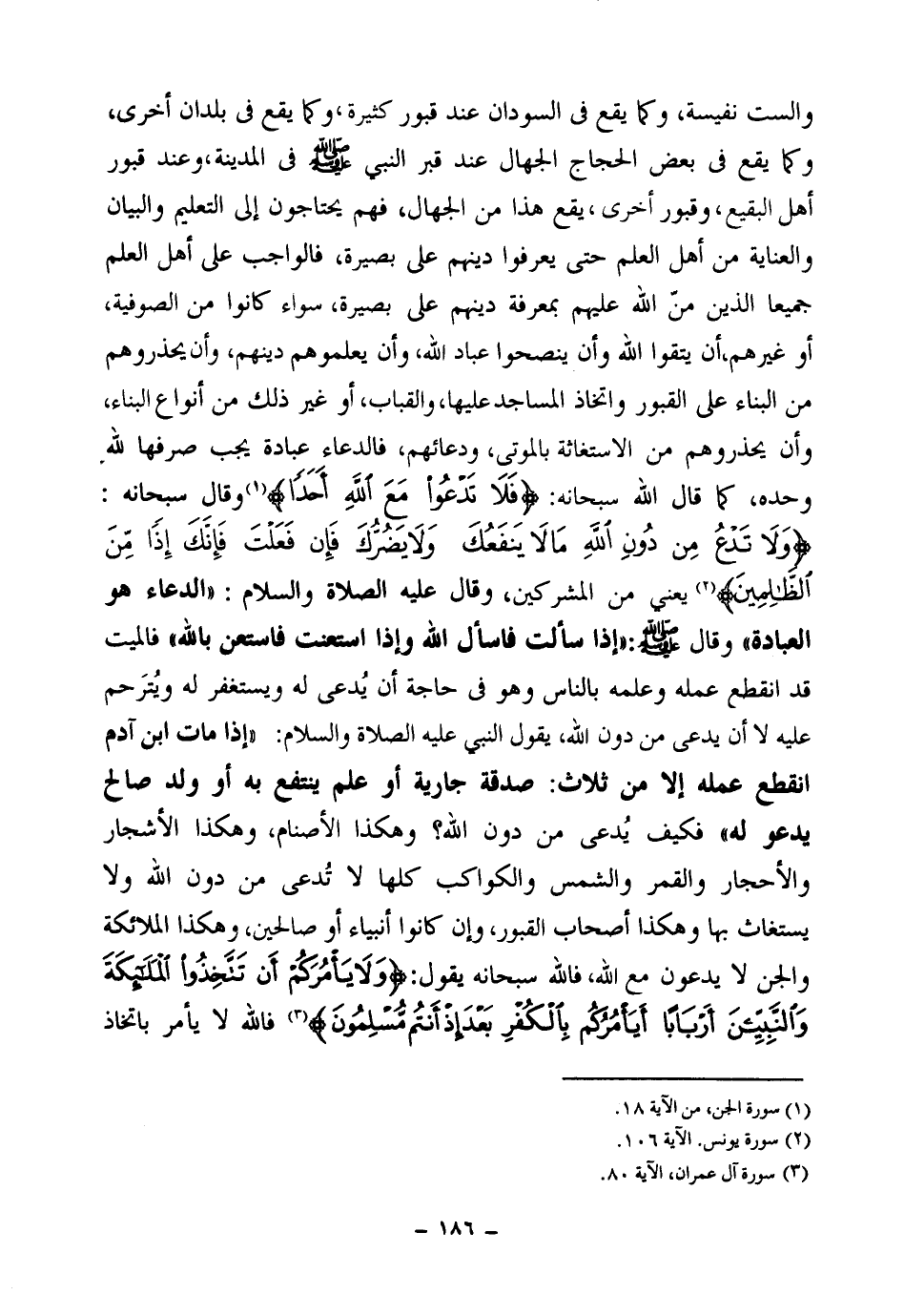 فالواجب على أهل العلم جميعا الذين من الله عليهم بمعرفة دينهم على بصيرة سواء كانوا من الصوفية أو غيرهم، أن يتقوا الله وأن ينصحوا عباد الله وأن يعلموهم دينهم وأن يحذروهم من البناء على القبور واتخاذ المساجد عليها والقباب أو غير ذلك من أنواع البناء، وأن يحذروهم من الاستغاثة بالموتى ودعائهم فالدعاء عبادة يجب صرفها لله وحده، كما قال الله سبحانه {فَلَا تَدْعُوا مَعَ اللَّهِ أَحَدًا} (¬1) وقال سبحانه: {وَلَا تَدْعُ مِنْ دُونِ اللَّهِ مَا لَا يَنْفَعُكَ وَلَا يَضُرُّكَ فَإِنْ فَعَلْتَ فَإِنَّكَ إِذًا مِنَ الظَّالِمِينَ} (¬2) يعني من المشركين، وقال عليه الصلاة والسلام: «الدعاء هو العبادة (¬3) » وقال صلى الله عليه وسلم: «إذا سألت فاسأل الله وإذا استعنت فاستعن بالله (¬4) » فالميت قد انقطع عمله وعلمه بالناس وهو في حاجة أن يدعى له ويستغفر له ويترحم عليه لا أن يدعى من دون الله، يقول النبي عليه السلام: «إذا مات ابن آدم انقطع عمله إلا من ثلاث صدقة جارية أو علم ينتفع به أو ولد صالح يدعو له (¬5) » فكيف يدعى من دون الله؟ وهكذا الأصنام وهكذا الأشجار والأحجار والقمر والشمس والكواكب كلها لا تدعى من دون الله ولا يستغاث بها وهكذا أصحاب القبور وإن كانوا أنبياء أو صالحين وهكذا الملائكة والجن لا يدعون مع الله فالله سبحانه يقول: {وَلَا يَأْمُرَكُمْ أَنْ تَتَّخِذُوا الْمَلَائِكَةَ وَالنَّبِيِّينَ أَرْبَابًا أَيَأْمُرُكُمْ بِالْكُفْرِ بَعْدَ إِذْ أَنْتُمْ مُسْلِمُونَ} (¬6) فالله لا يأمر باتخاذ