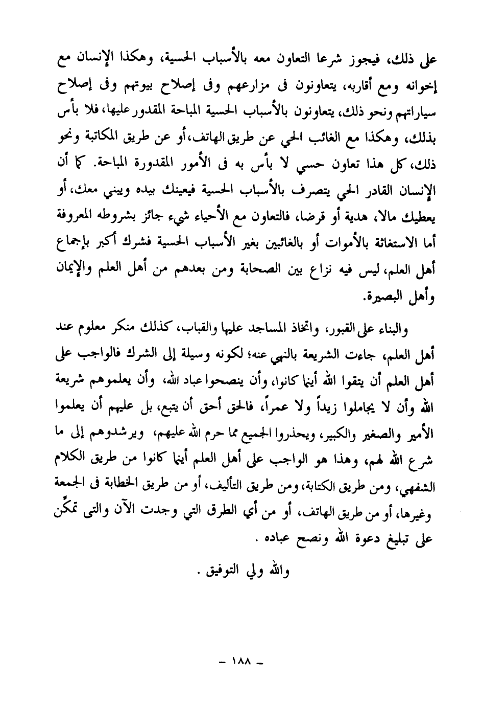 على ذلك، فيجوز شرعا التعاون معه بالأسباب الحسية، وهكذا الإنسان مع إخوانه ومع أقاربه يتعاونون في مزارعهم، وفي إصلاح بيوتهم، وفي إصلاح سياراتهم ونحو ذلك، يتعاونون بالأسباب الحسية المباحة المقدور عليها فلا بأس بذلك، وهكذا مع الغائب الحي عن طريق الهاتف أو عن طريق المكاتبة ونحو ذلك كل هذا تعاون حسي لا بأس به في الأمور المقدورة المباحة. كما أن الإنسان القادر الحي يتصرف بالأسباب الحسية فيعينك بيده ويبني معك أو يعطيك مالا، هدية أو قرضا، فالتعاون مع الأحياء شيء جائز بشروطه المعروفة أما الاستغاثة بالأموات أو بالغائبين بغير الأسباب الحسية فشرك أكبر بإجماع أهل العلم ليس فيه نزاع بين الصحابة ومن بعدهم من أهل العلم والإيمان وأهل البصيرة.