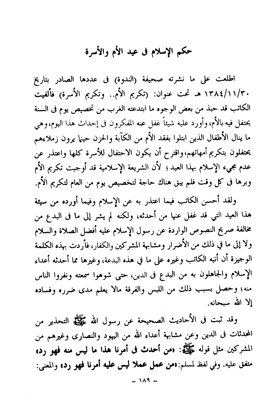 اطلعت على ما نشرته صحيفة (الندوة) في عددها الصادر بتاريخ 30 \ 11 \ 1384 هـ تحت عنوان: (تكريم الأم. وتكريم الأسرة) فألفيت الكاتب قد حبذ من بعض الوجوه ما ابتدعته الغرب من تخصيص يوم في السنة يحتفل فيه بالأم وأورد عليه شيئا غفل عنه المفكرون في إحداث هذا اليوم وهي ما ينال الأطفال الذين ابتلوا بفقد الأم من الكآبة والحزن حينما يرون زملاءهم يحتفلون بتكريم أمهاتهم، واقترح أن يكون الاحتفال للأسرة كلها واعتذر عن عدم مجيء الإسلام بهذا العيد؛ لأن الشريعة الإسلامية قد أوجبت تكريم الأم وبرها في كل وقت فلم يبق هناك حاجة لتخصيص يوم من العام لتكريم الأم.